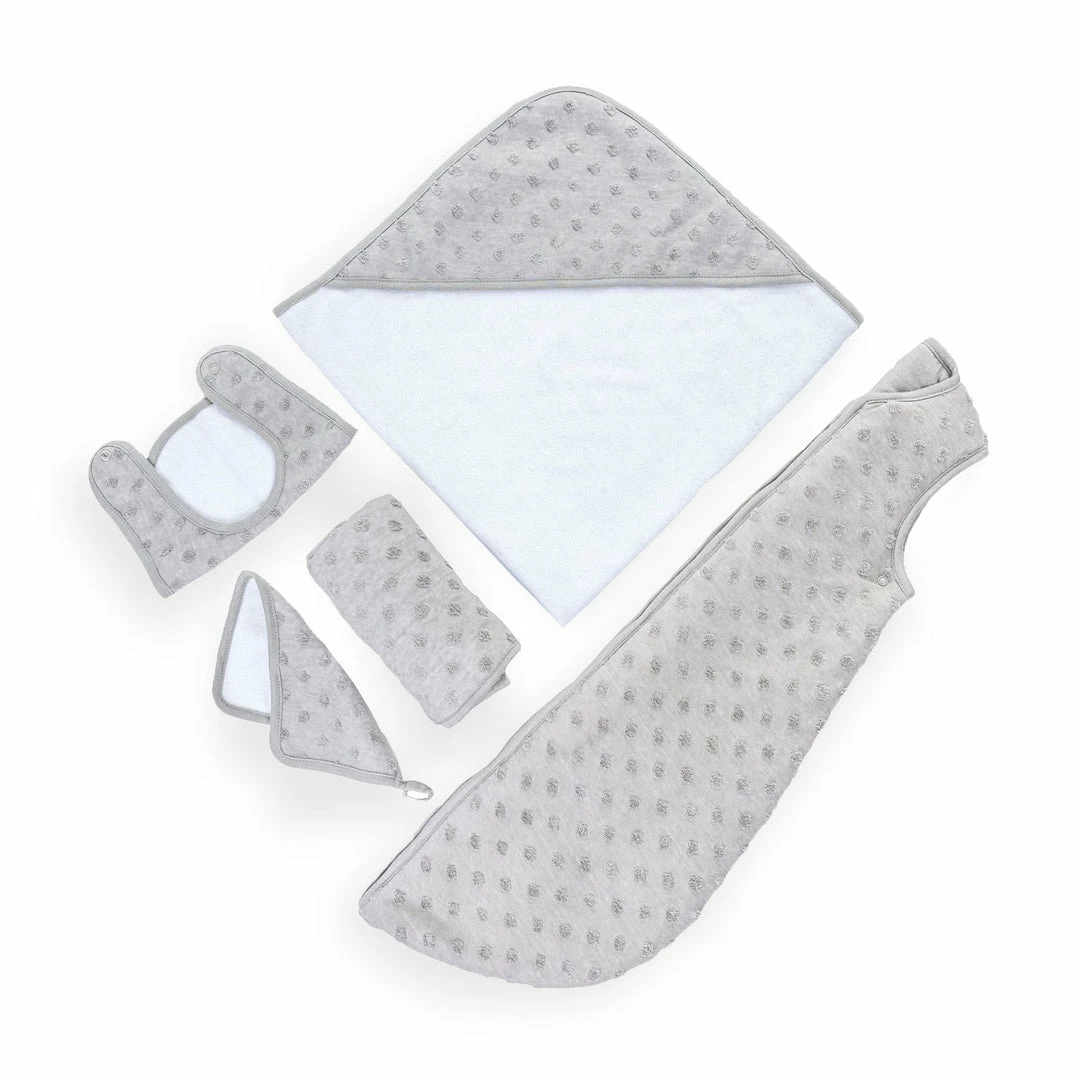 An excellent balance between comfort, style and practicality the bundle includes 1 x Sleeping Bag (0-6 months), 1 x Blanket, 1 x Hooded Towel, 1 x Wash Glove & 3 x Bibs. The Polycotton fabric ensures breathability, and insulation during the colder months.