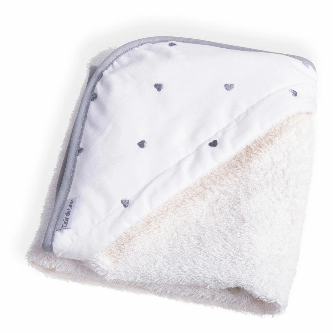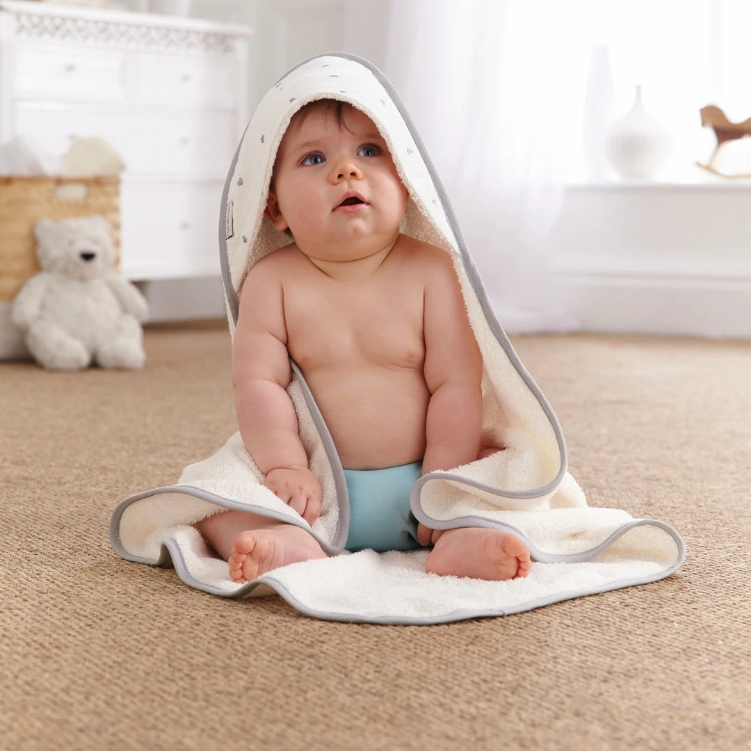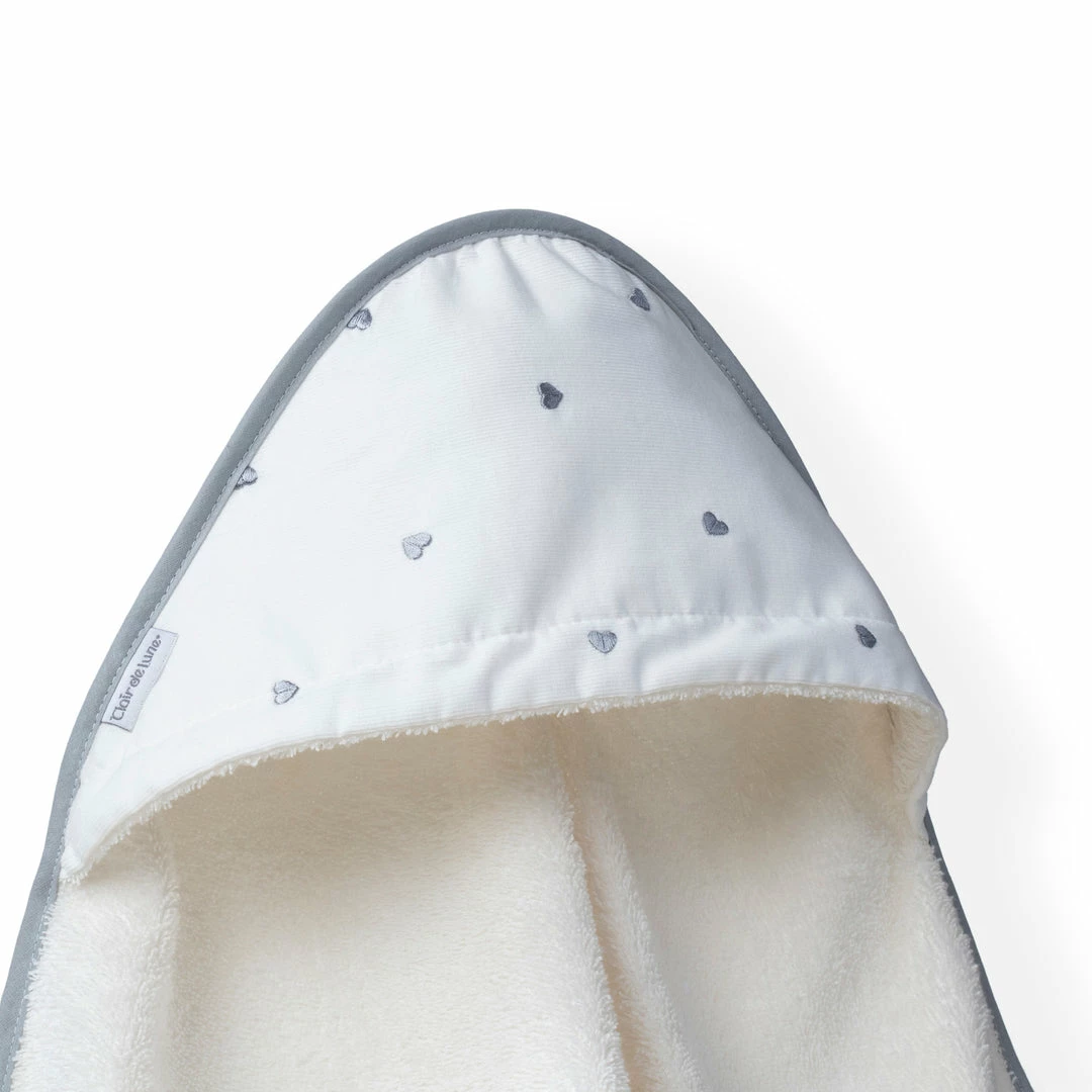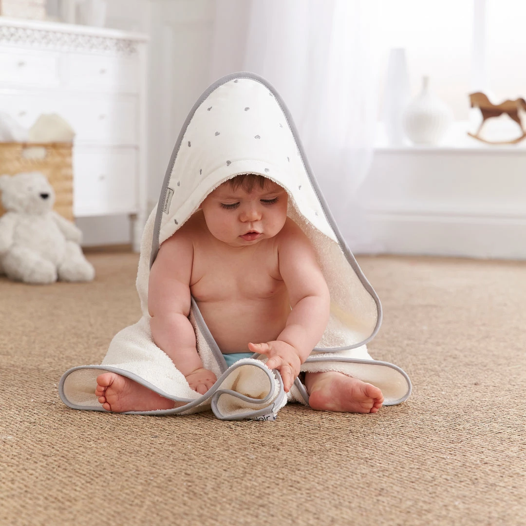 Keep your little one warm after bath time with the beautifully soft Lullaby Hearts Hooded Towel, featuring luxurious cotton piqué on the hood with delicate embroidered grey hearts.