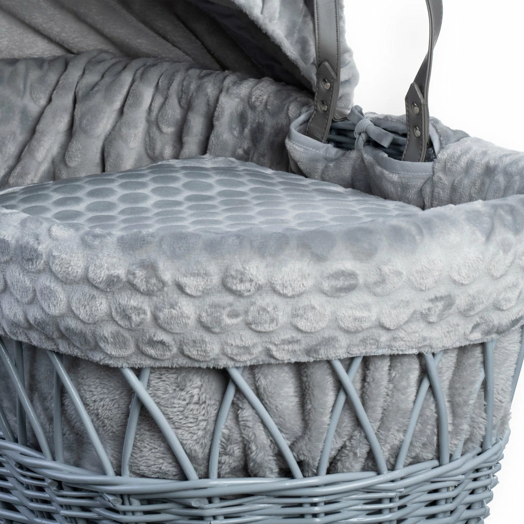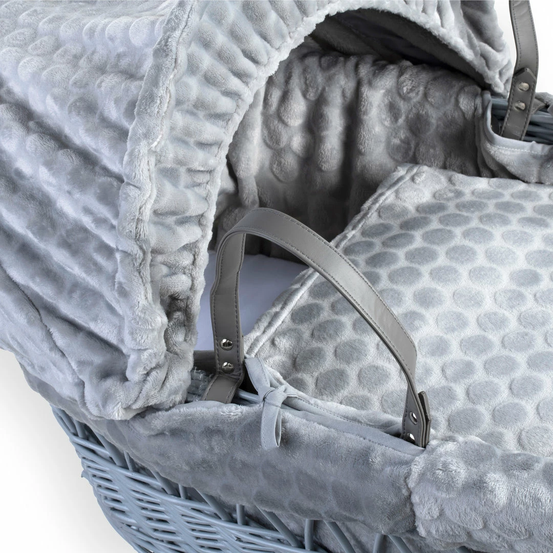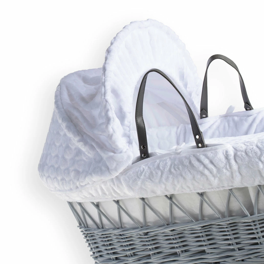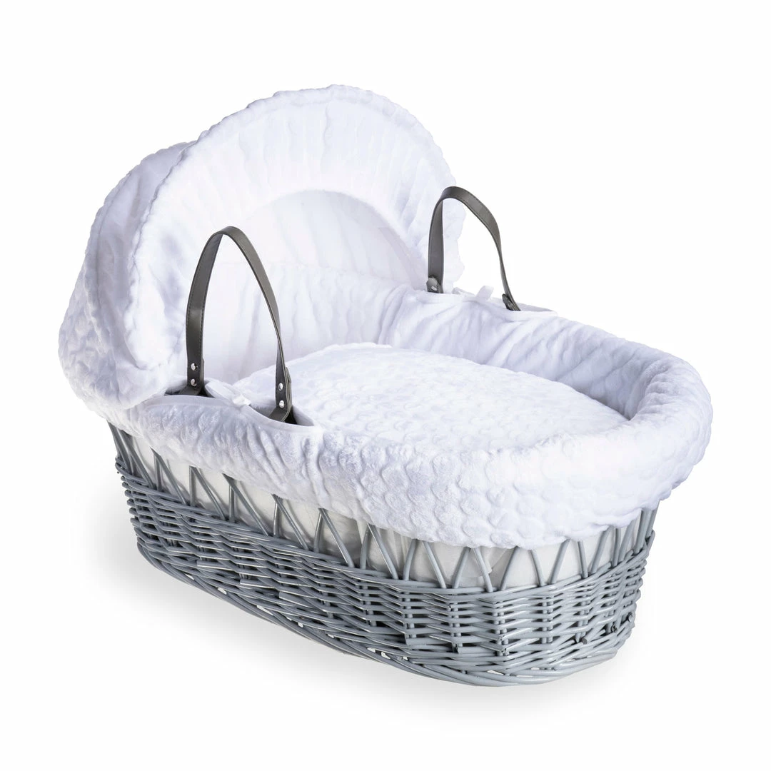A beautiful Moses basket made from soft, plush subtly patterned Marshmallow fabric, will complete any nursery perfectly.