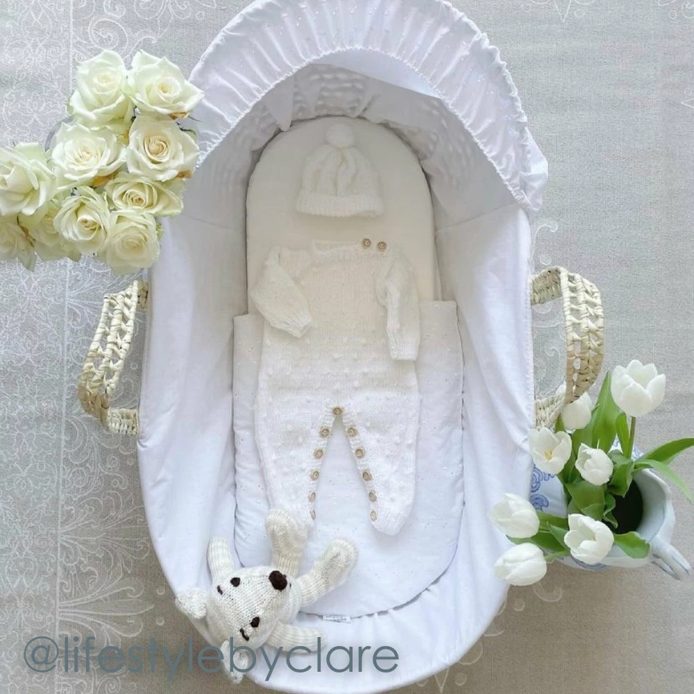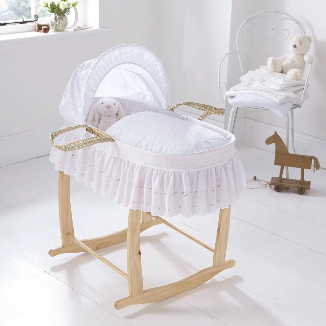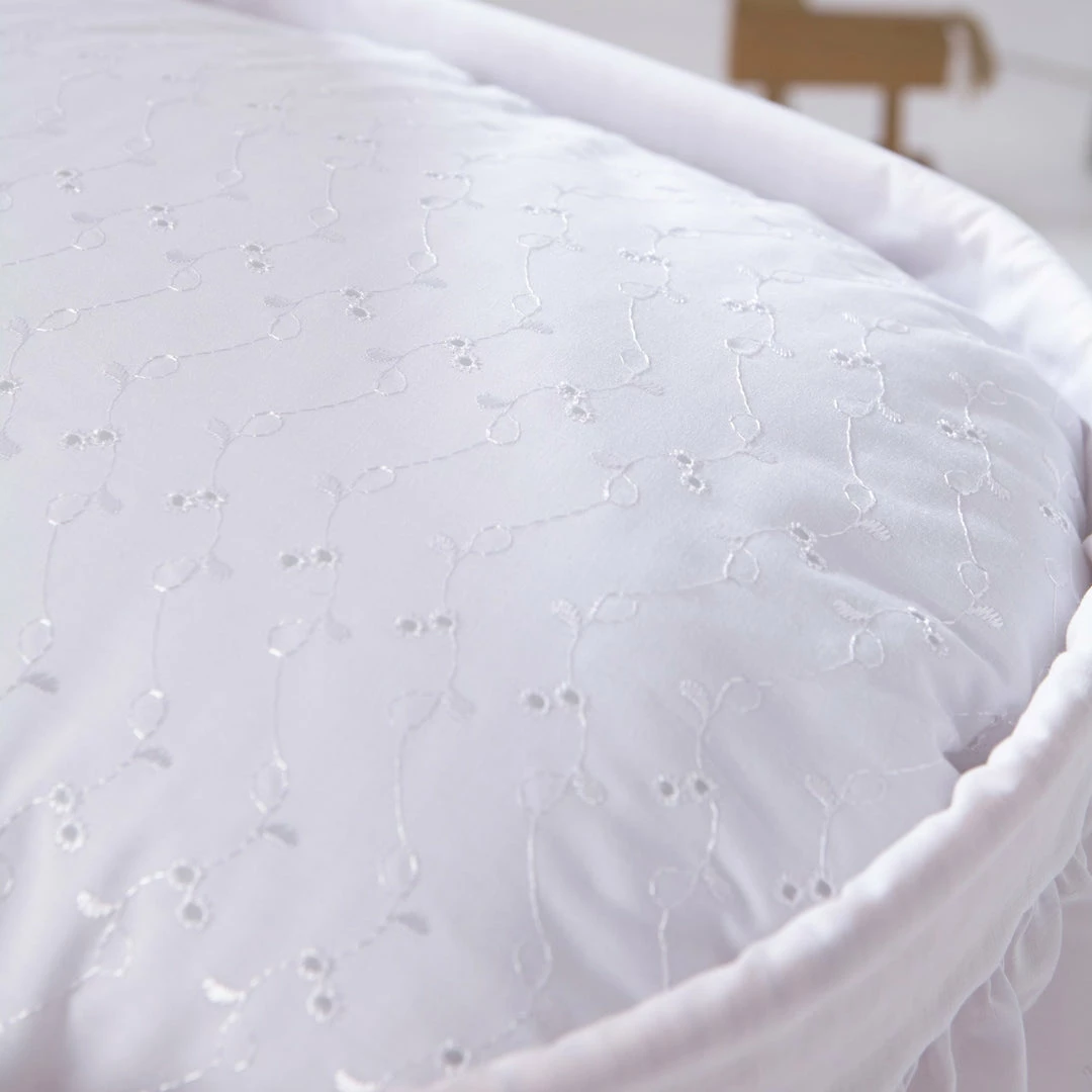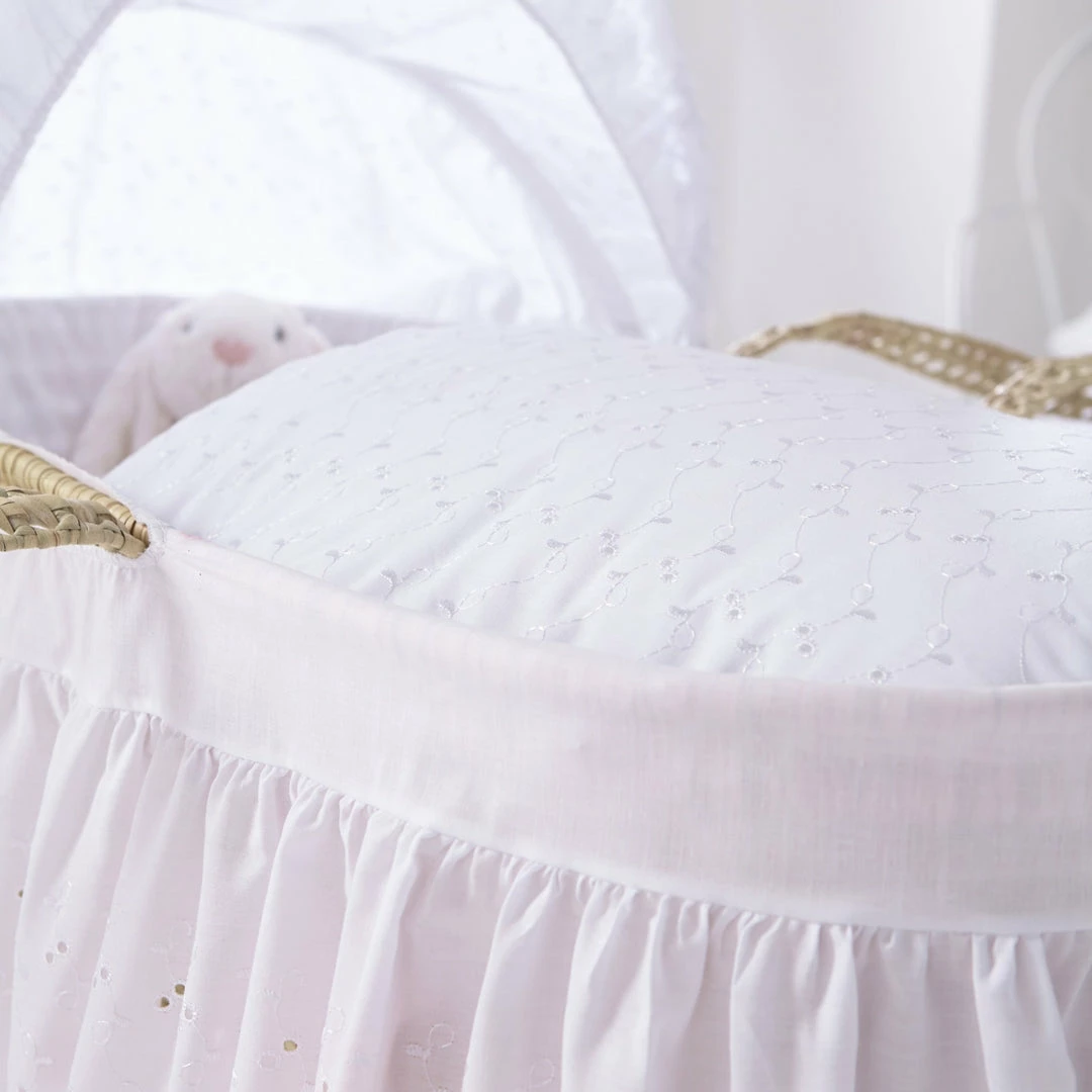 The Austrian Broderie Anglaise fabric has been combined with velvet and Broderie Anglaise trims to create this vintage-style Moses bedding set. It looks glorious in both modern and traditional nurseries thanks to its neutral design.