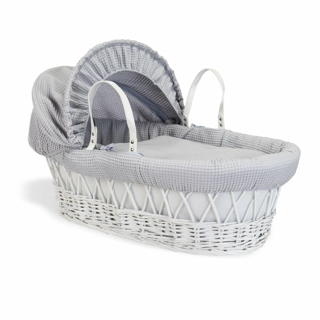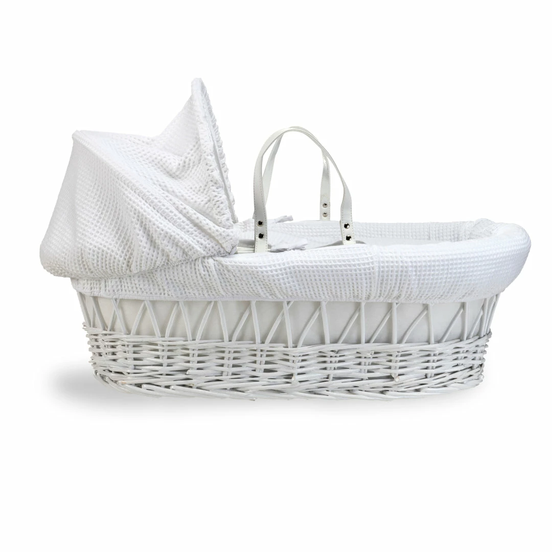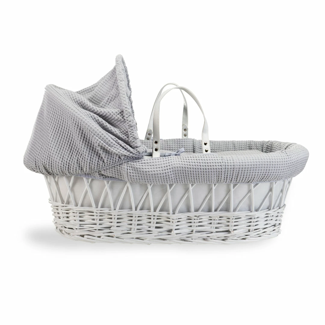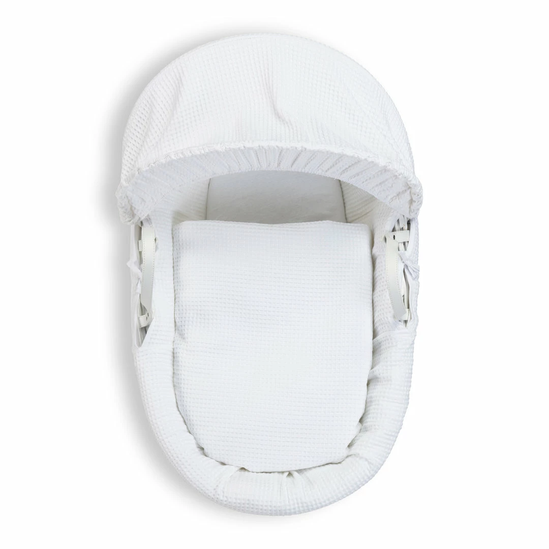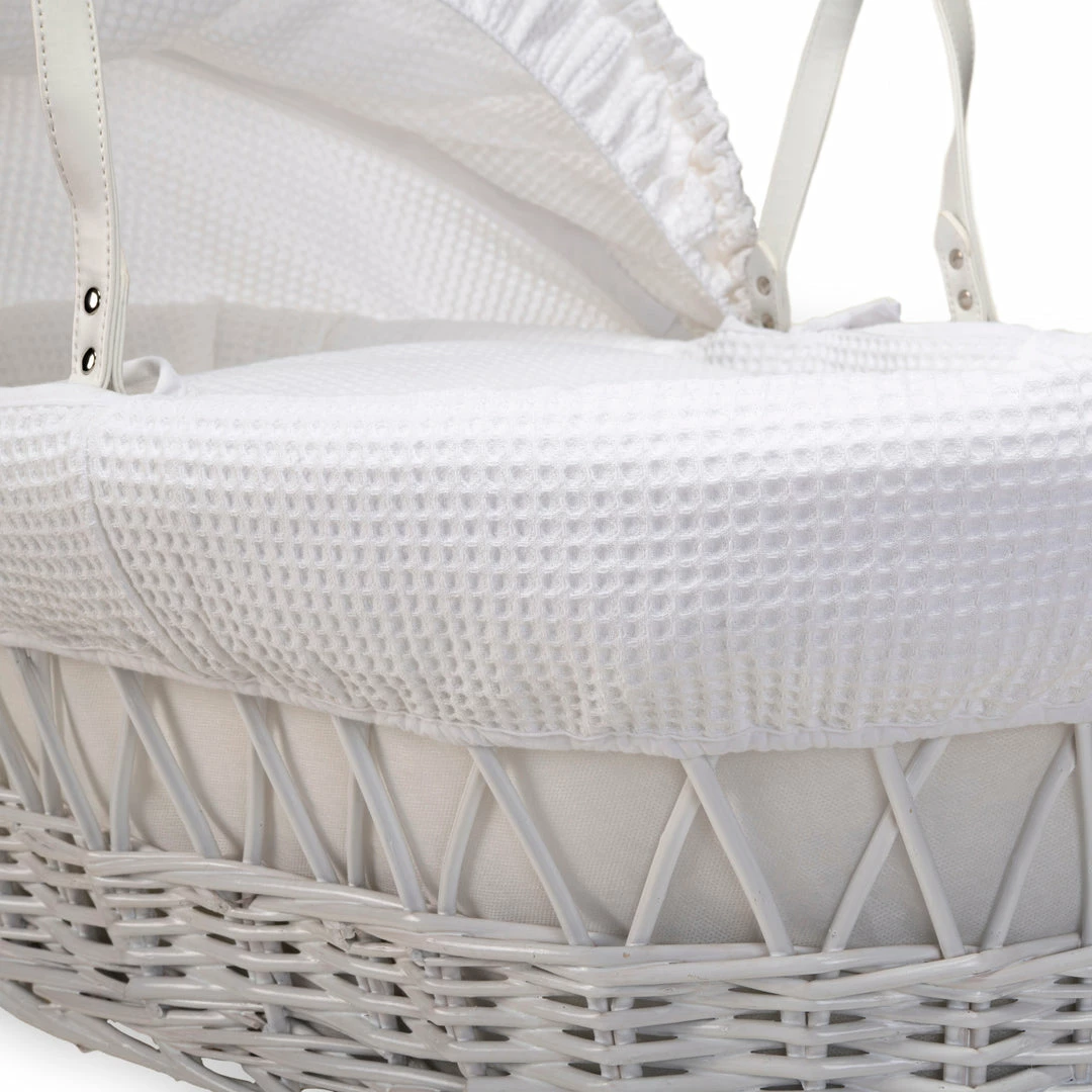 This chic white wicker Moses basket is dressed using super soft waffle cotton fabrics that are kind to baby’s delicate skin, and create a cosy breathable sleeping space for your baby.