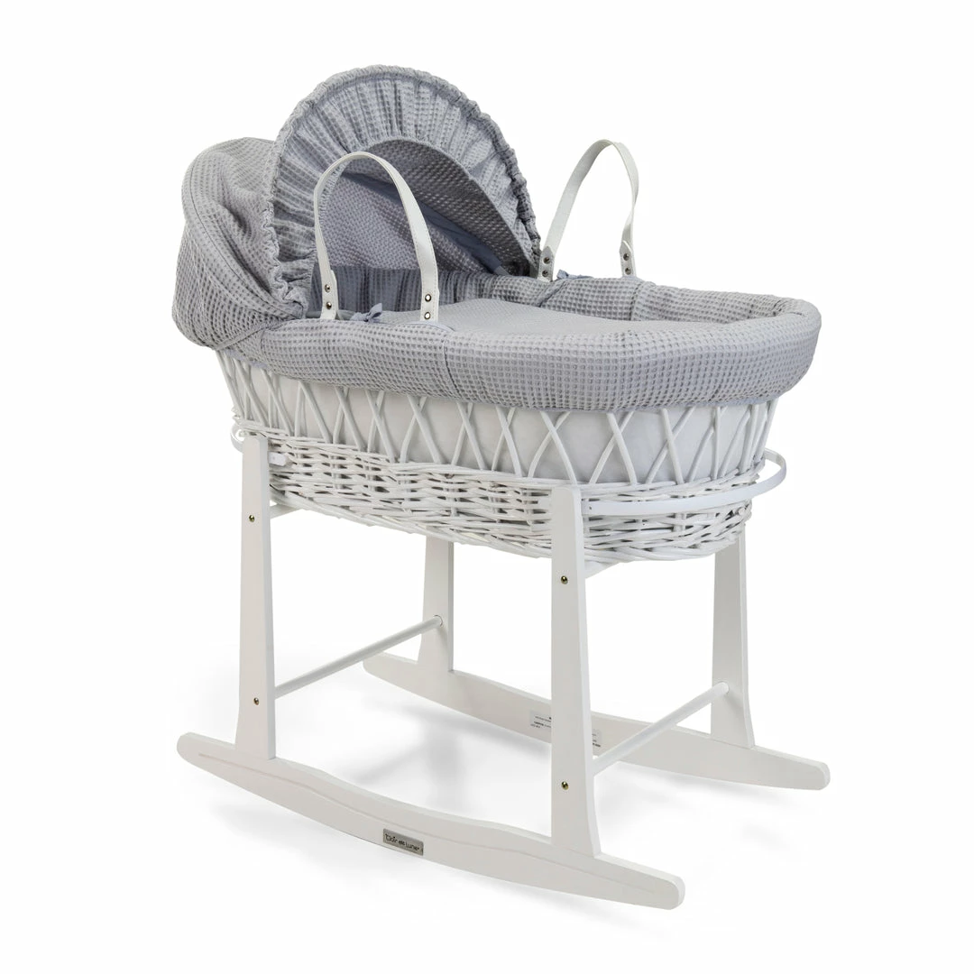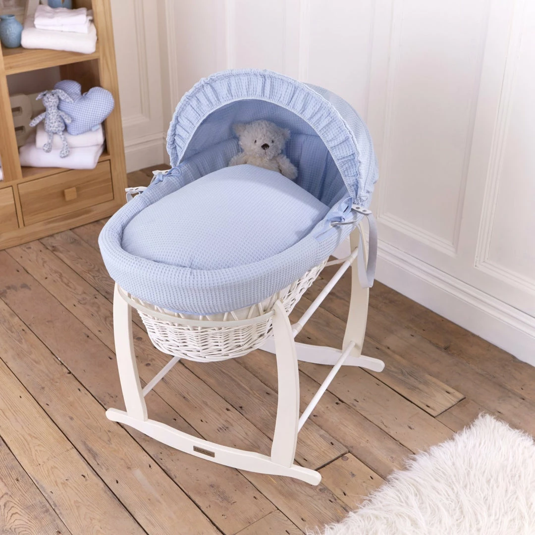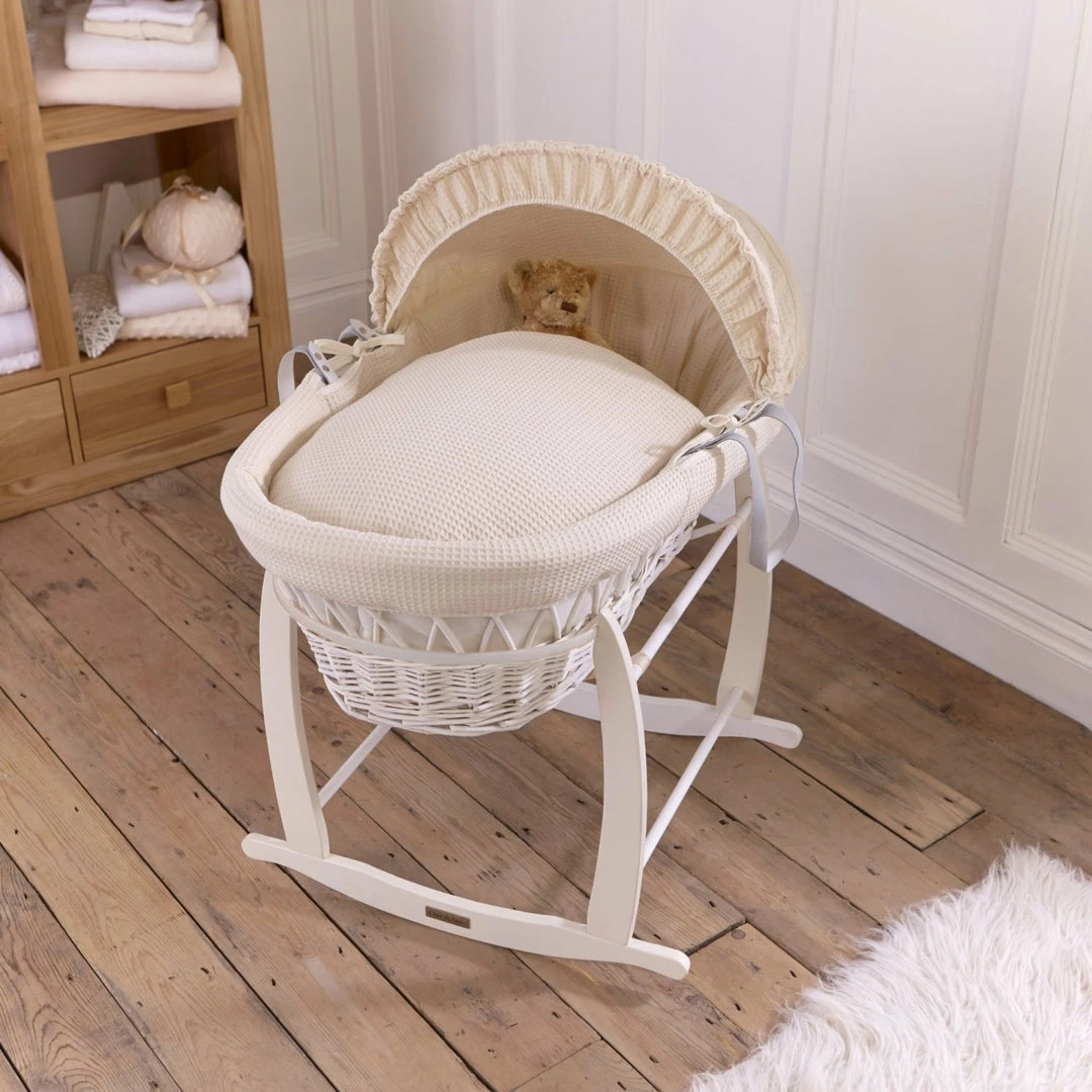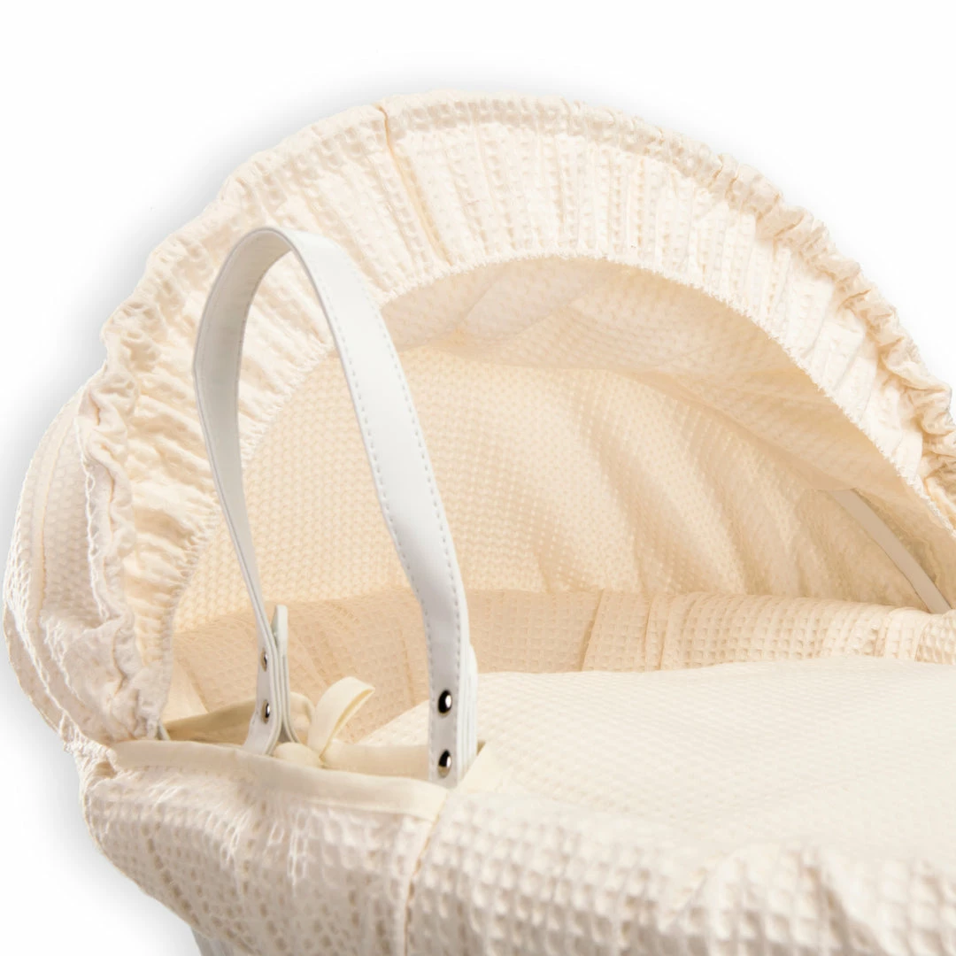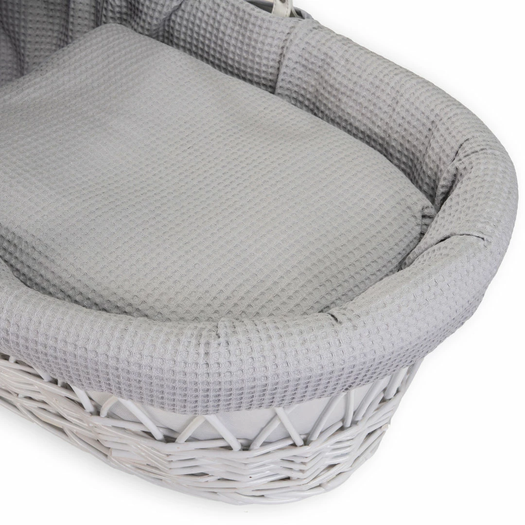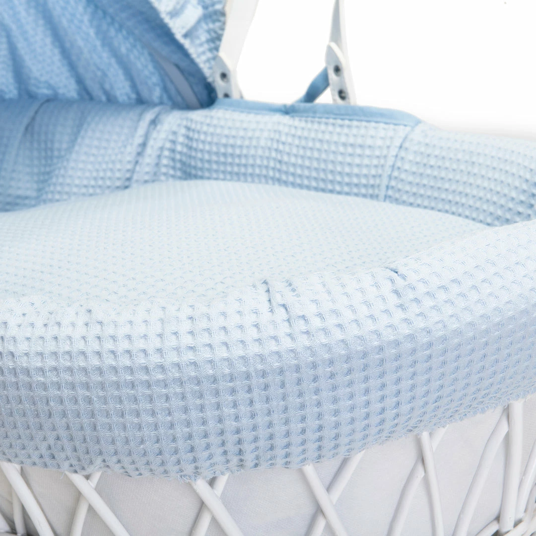 This chic white wicker Moses basket is dressed using super soft waffle cotton fabrics that are kind to baby’s delicate skin, and create a cosy breathable sleeping space for your baby.