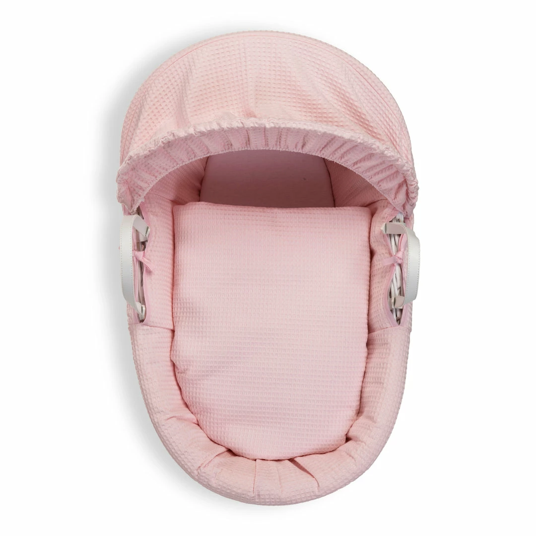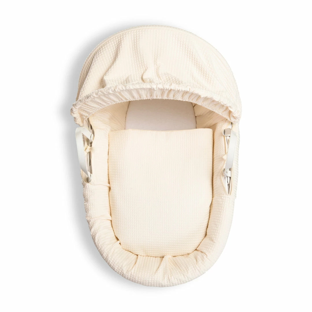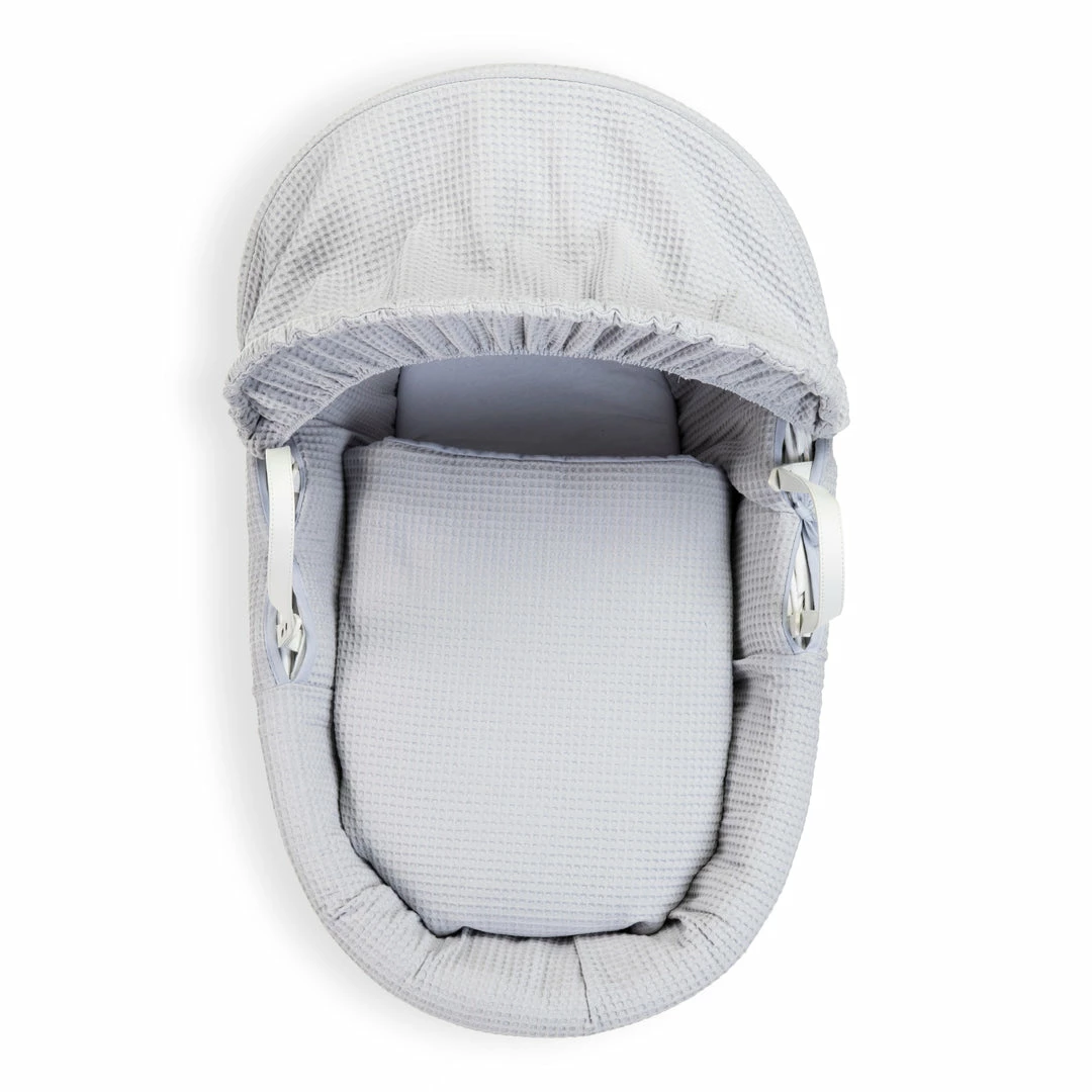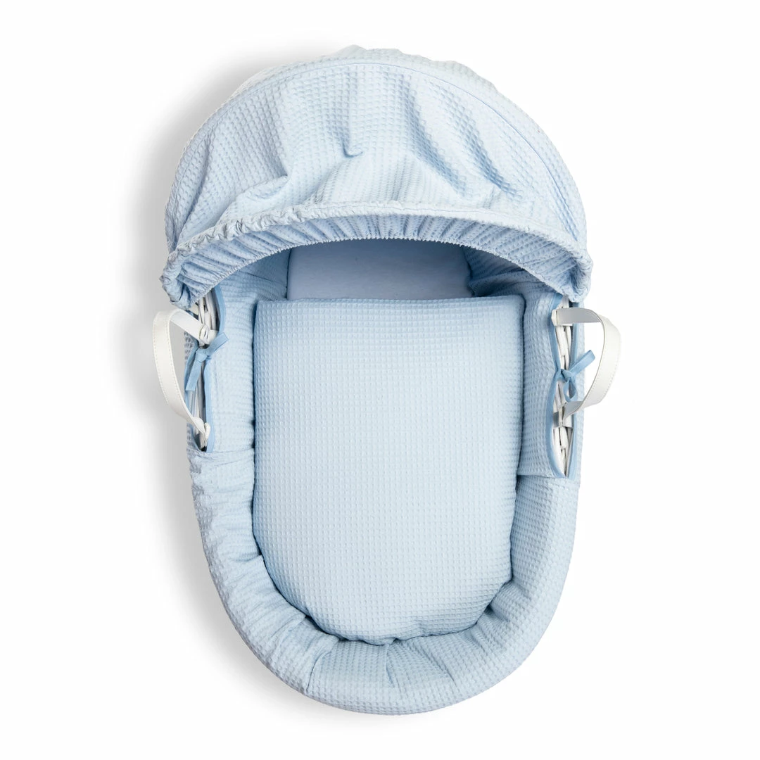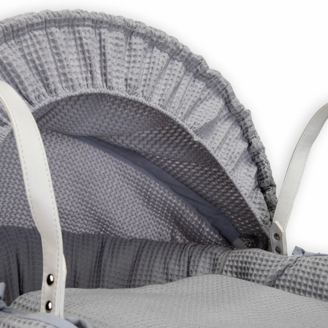 This chic white wicker Moses basket is dressed using super soft waffle cotton fabrics that are kind to baby’s delicate skin, and create a cosy breathable sleeping space for your baby.