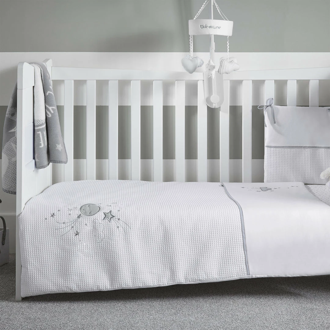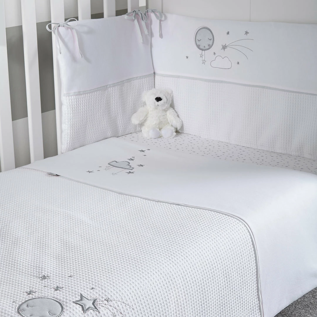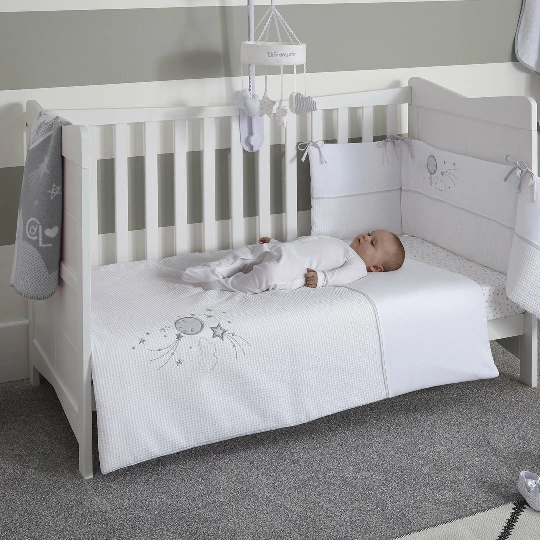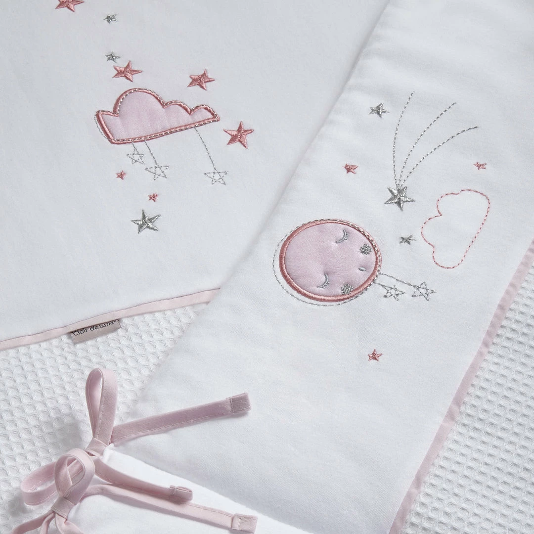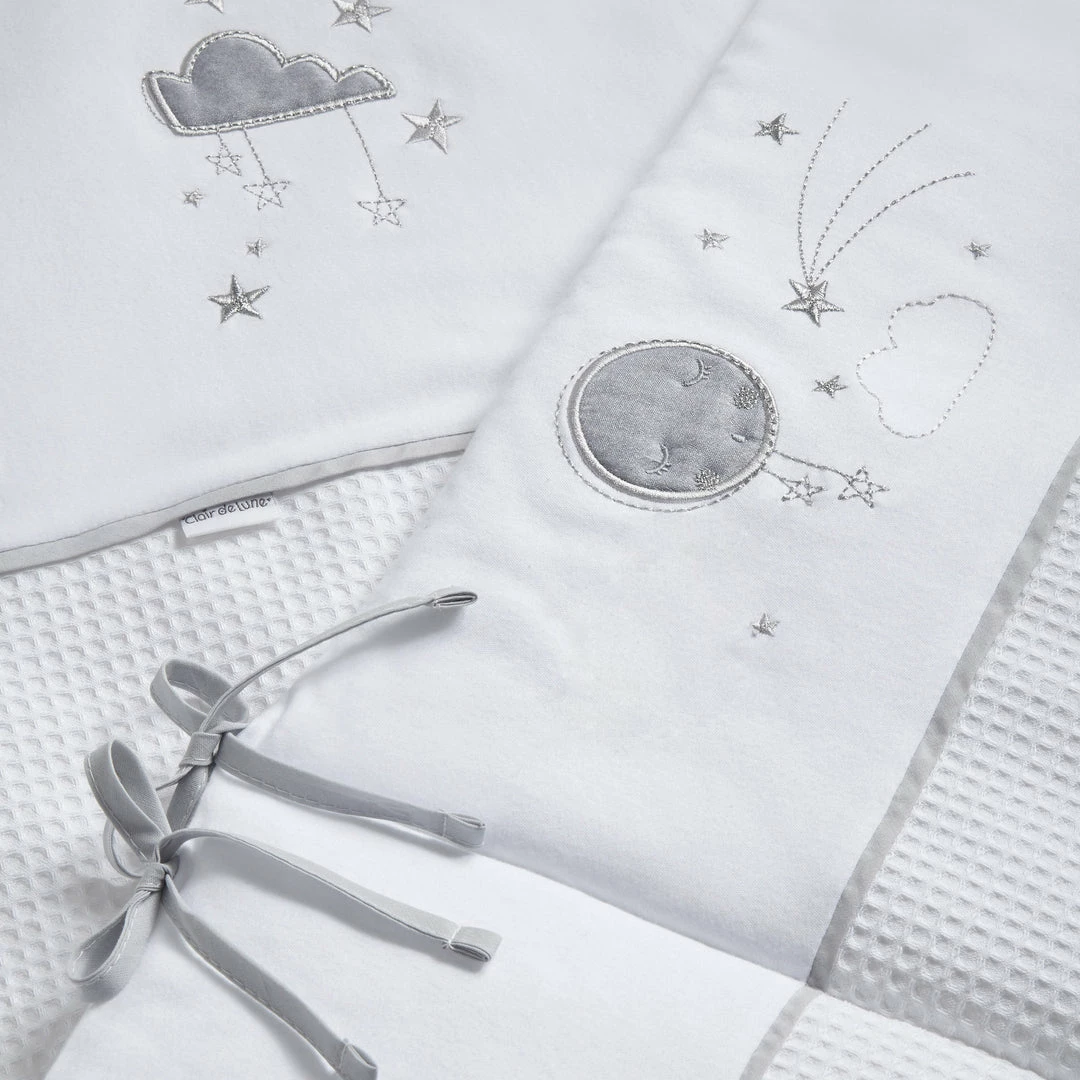 *Bedding only, cot is used for illustrative purposes only. This Clair de Lune cot bumper is designed to fit most cots; securely tie it to the head of the cot and regularly check that it is securely tied in place. Remove once baby can sit up unaided.