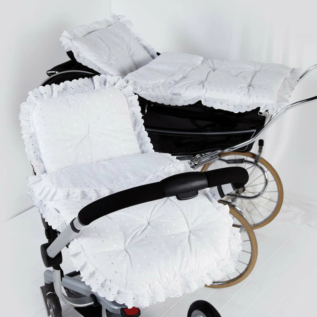 The Austrian Broderie Anglaise fabric has been combined velvet and Broderie Anglaise trims to create this vintage style Footmuff and pillow pushchair set.