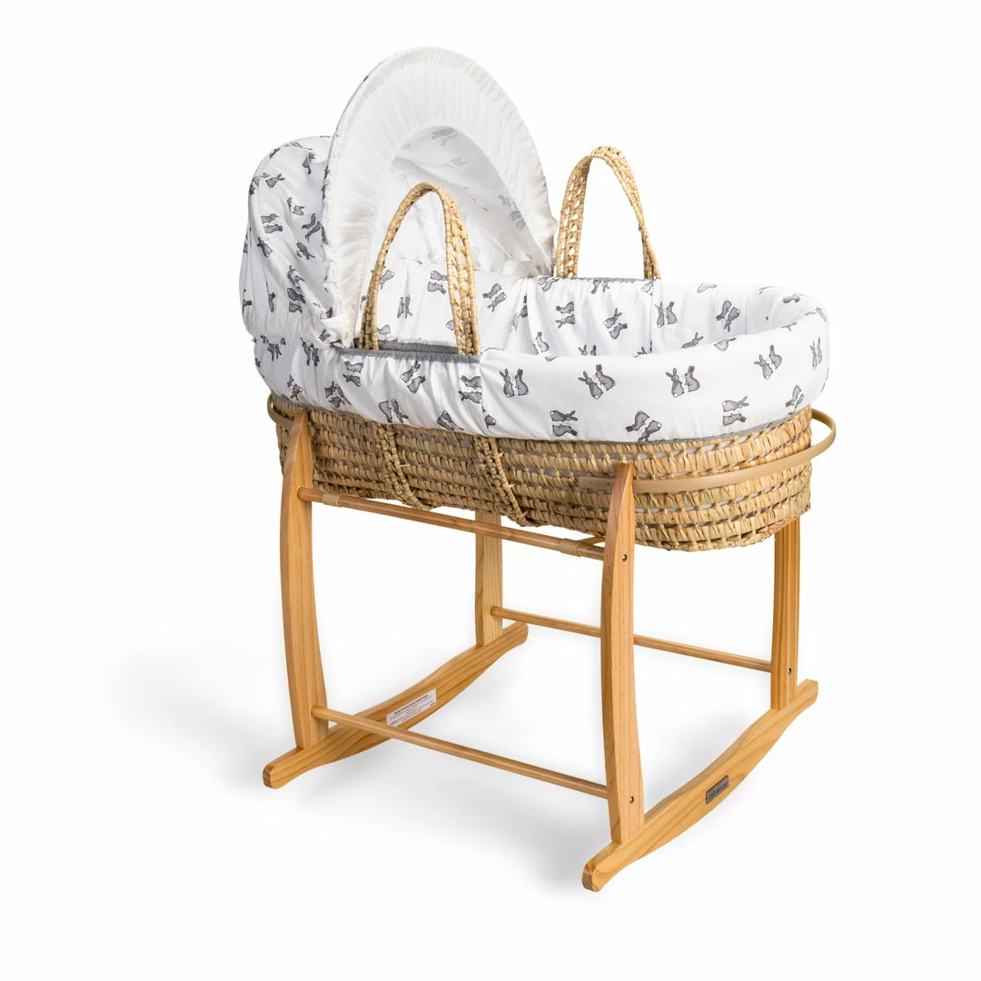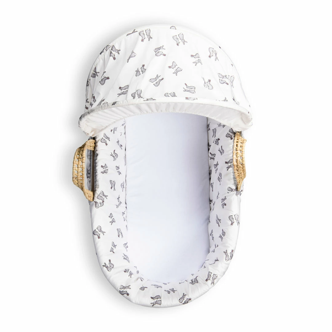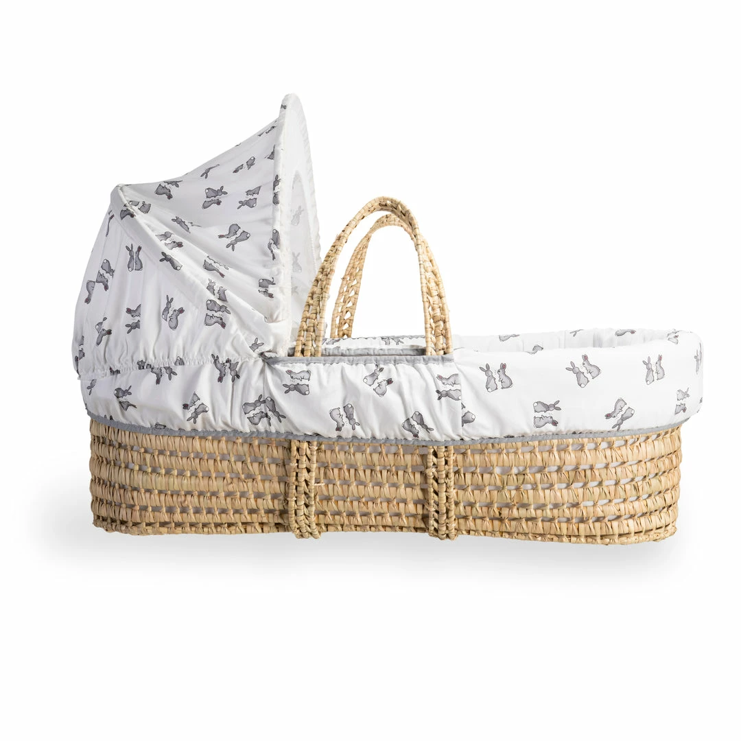 This beautiful Moses basket is made from natural Palm leaf and will complete any nursery perfectly. It comes with its own supportive mattress, dressing and removable hood. The Moses basket is dressed in the popular Rachel Riley Bunny premium cotton fabric; a cute-as-can-be grey bunny print!