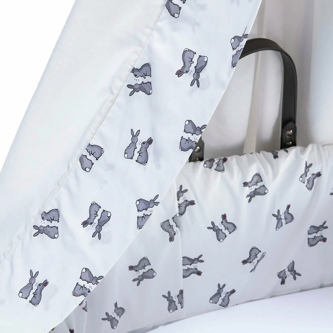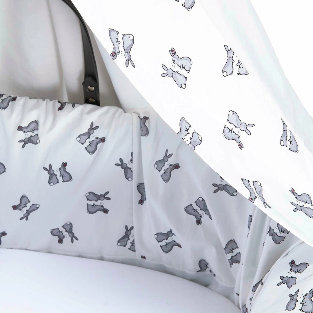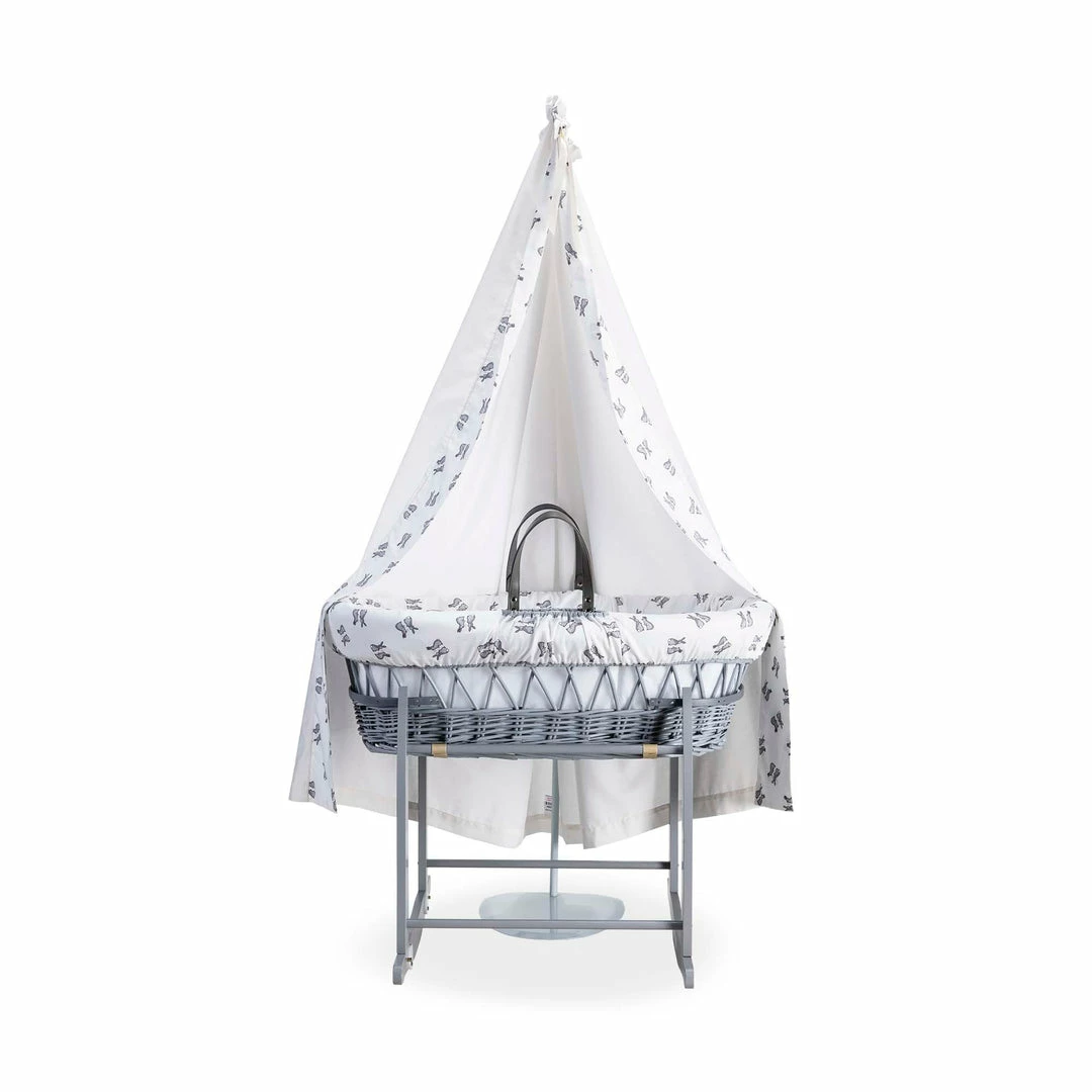 The Moses basket is lightweight and sturdy featuring two leather-look handles for ease of carrying.ย Made from all-natural, handwoven grey wicker. The cotton Moses bedding is crafted from one of Rachel Rileyโs best selling prints; a cute-as-can-be grey bunny print on premium cotton fabric.