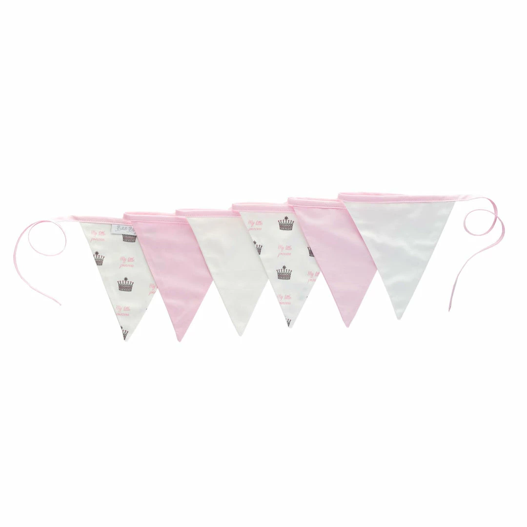 An adorable addition to your little oneโs nursery, this delicate bunting features Rachel Rileyโs iconic My Little Princess print with alternating ivory and pink flags, made from premium cotton, and matches back to the bedding collection.ย This 6-flag length of bunting also makes the perfect gift to dress a newborn babyโs bedroom.