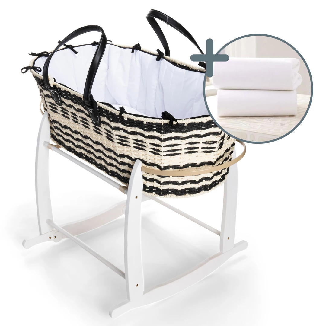 - Newborn essentials coming complete with aย black and cream sustainable basket, a white dressing, a firm microfibre and a deluxe rocking stand.