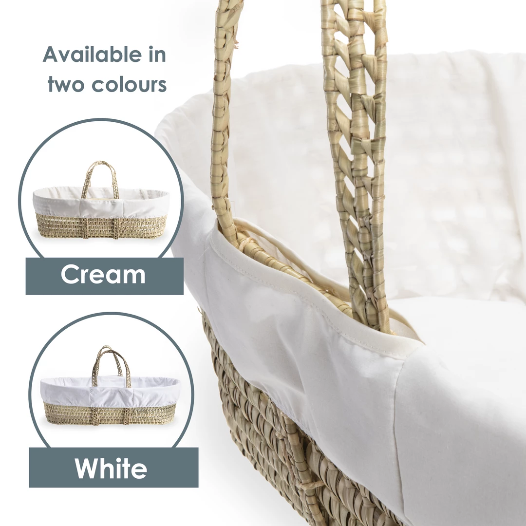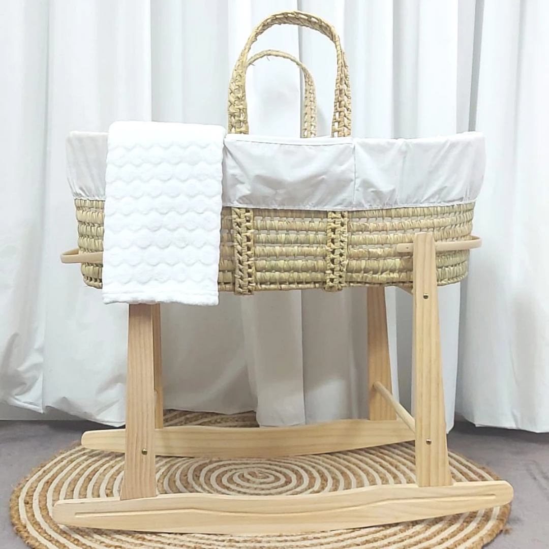 โข Comes complete with handwoven palm Moses basket, simplistic dressing, hypo-allergenic fibre mattress,ย single white mattress sheet, ultra-soft white Marshmallowย blanketย & one of our natural rocking stands.
