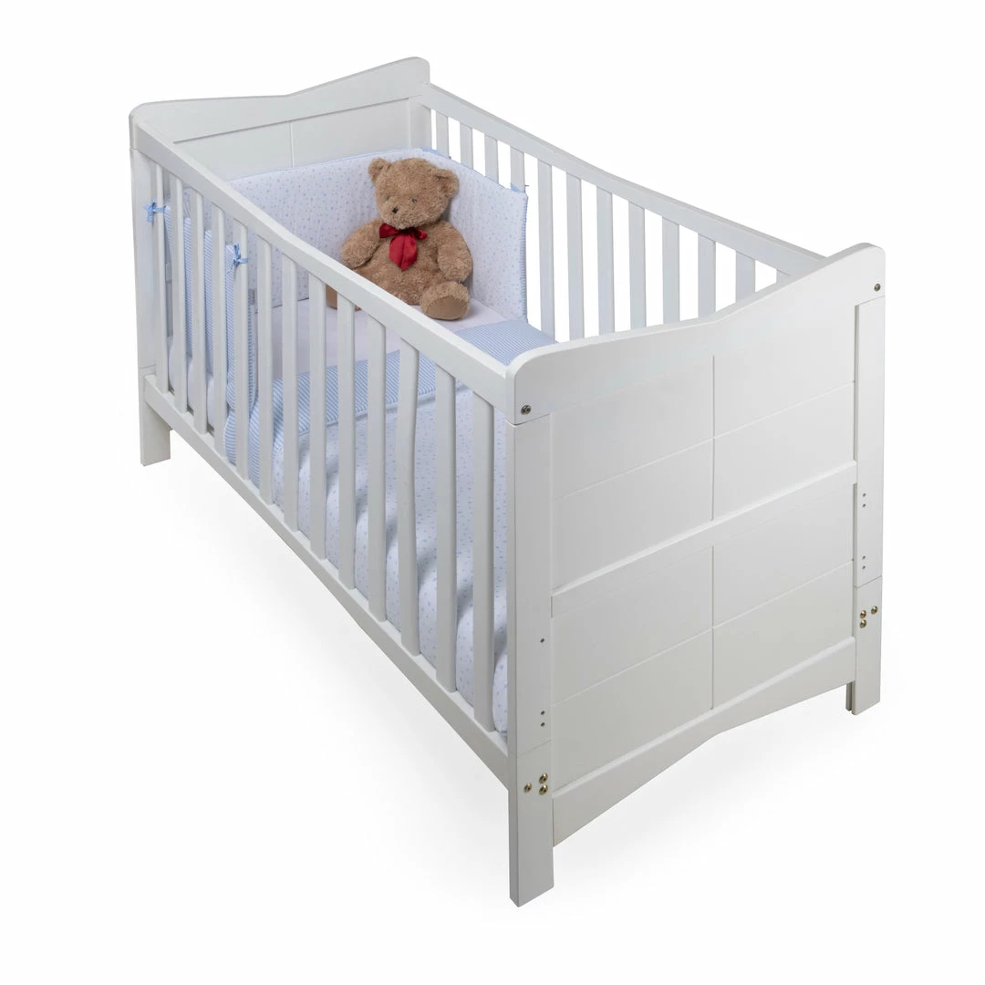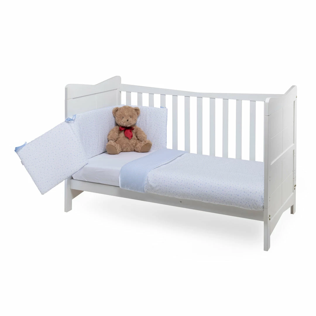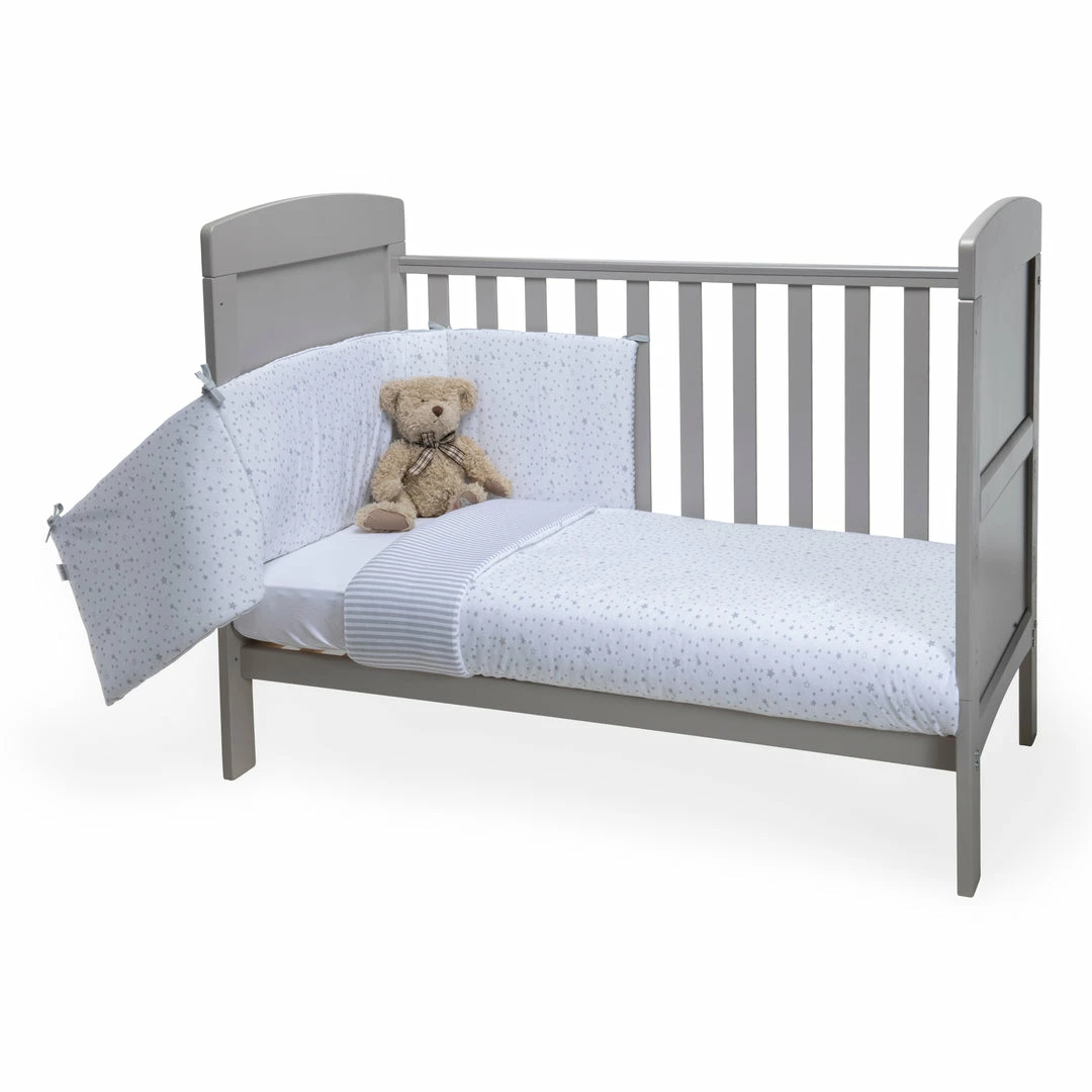 Suitable for cots, cot beds and toddler beds. This Clair de Lune cot bumper is designed to fit most cots; securely tie it to the head of the cot and regularly check that it is securely tied in place. Remove once baby can sit up unaided.