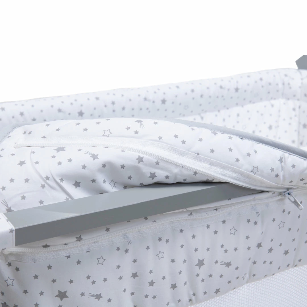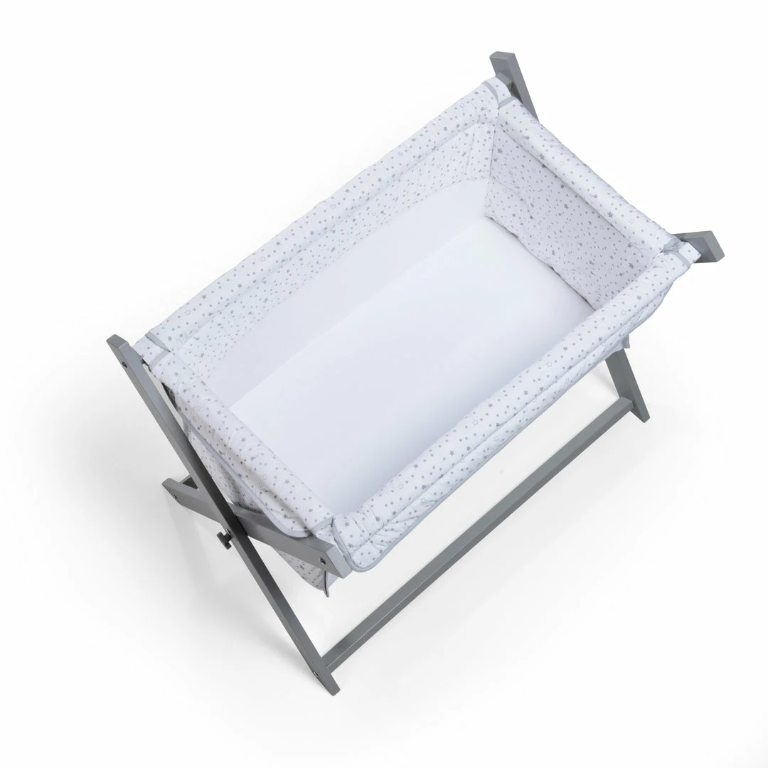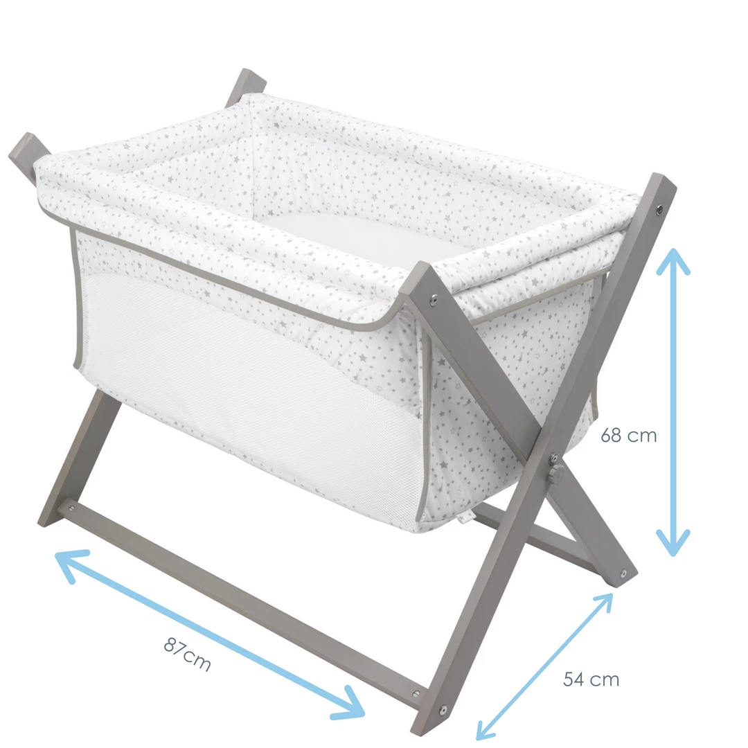 Dressed in a delicate Stars cotton jersey fabric in contemporary grey, the folding crib features breathable mesh side panels to ensure optimum air circulation and temperature control. Comes complete with a firm mattress to support your babyโs back, and FREE grey star-printedย fitted cotton sheet, creating a comfortable and cosy sleeping space.