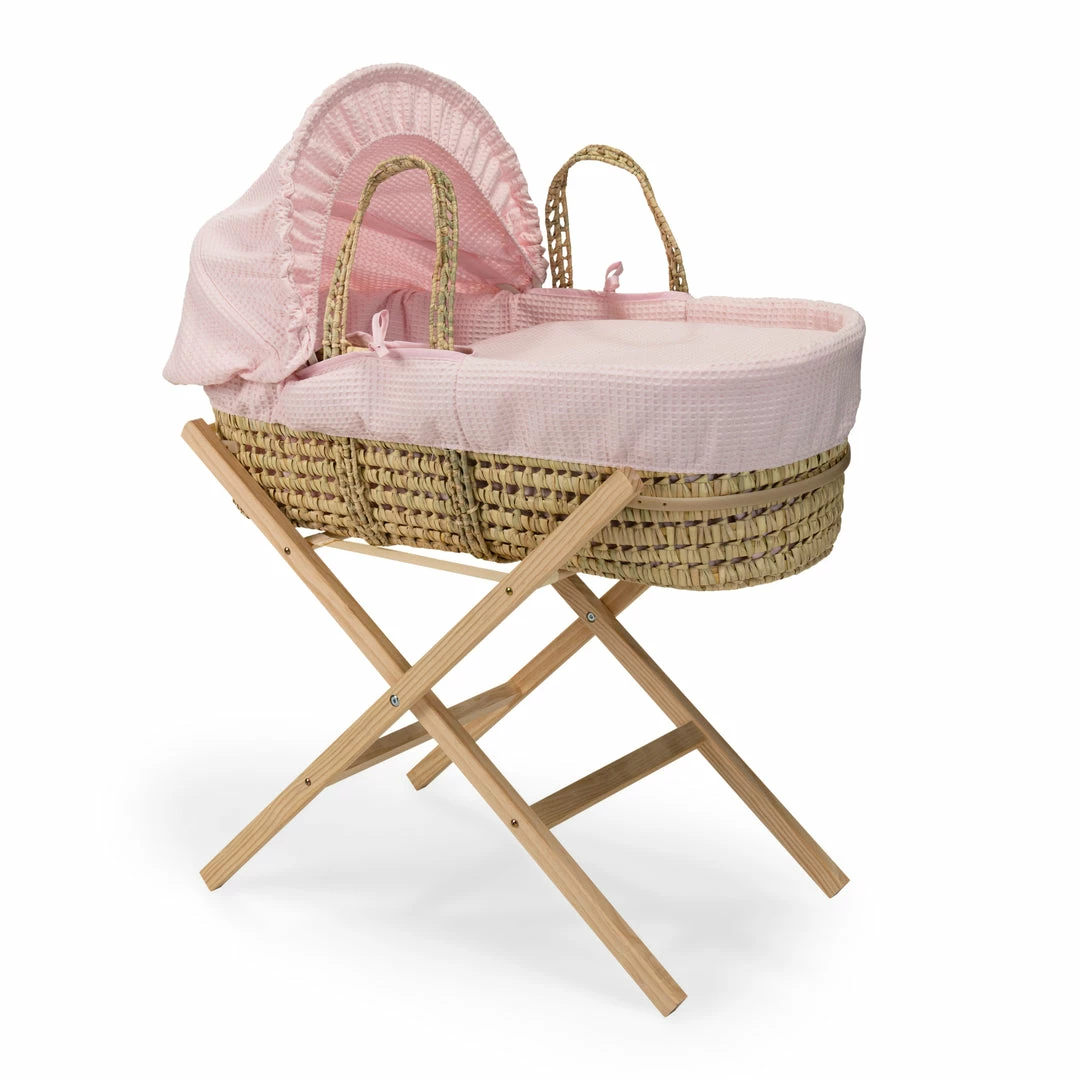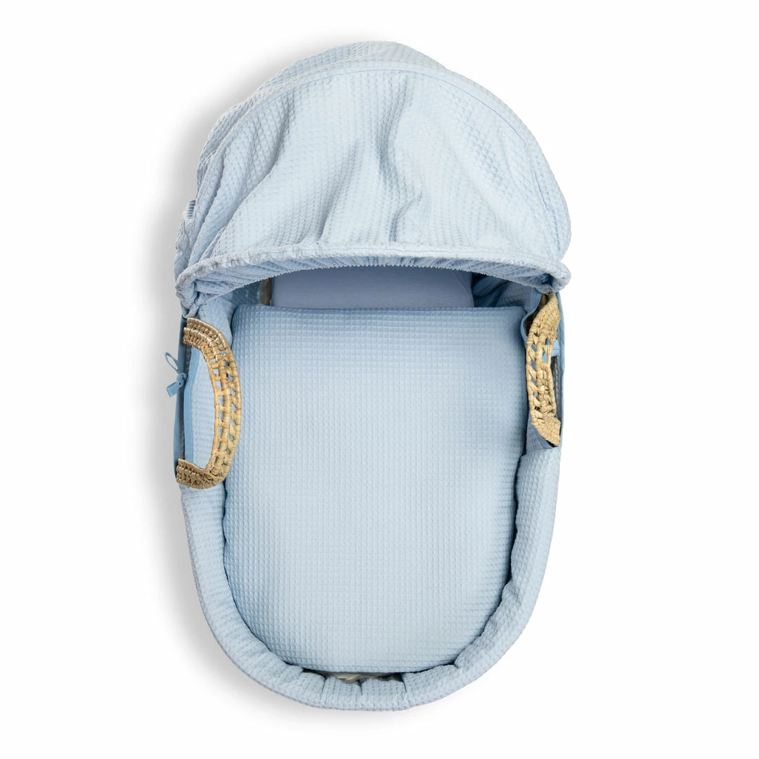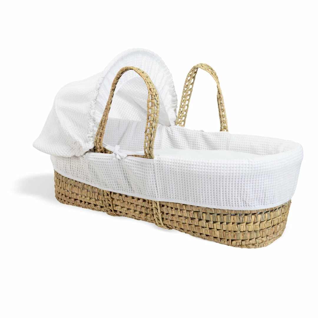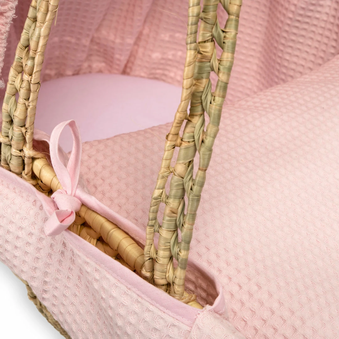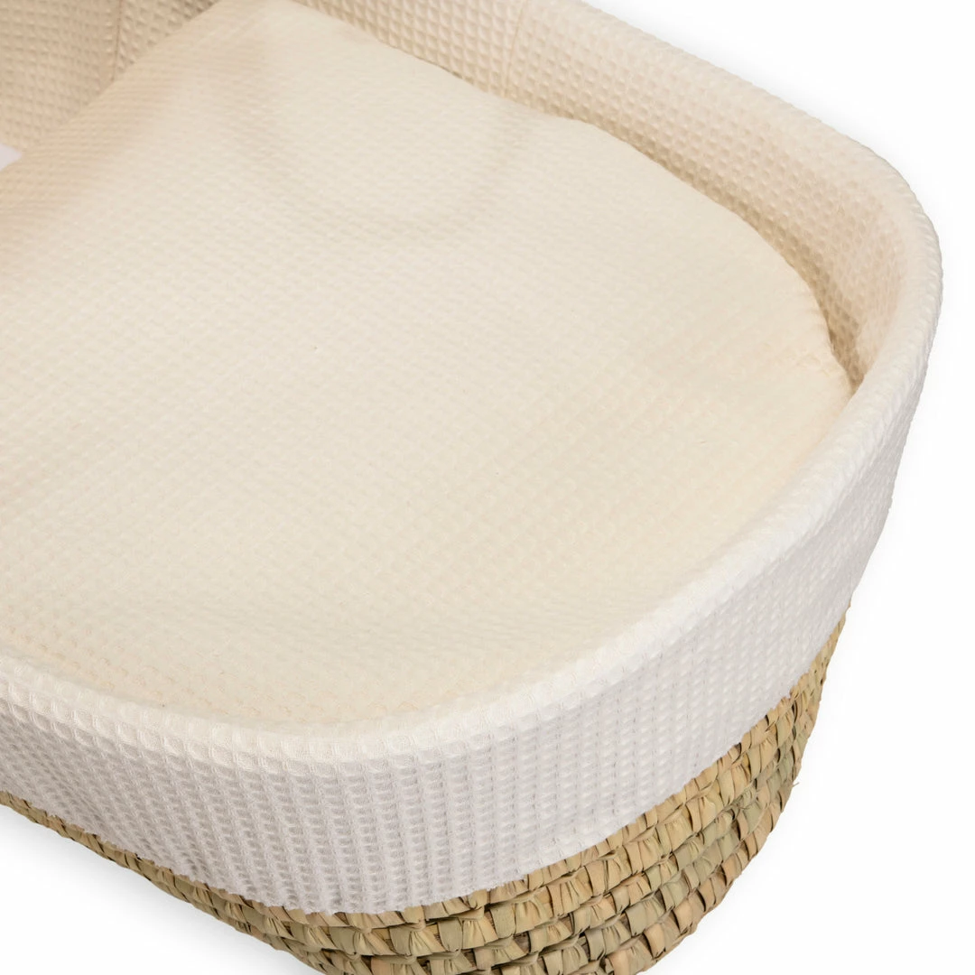 This traditional Palm Moses Basket is dressed using super soft waffle cotton fabrics that are kind to baby’s delicate skin, and create a cosy breathable sleeping space for your baby.