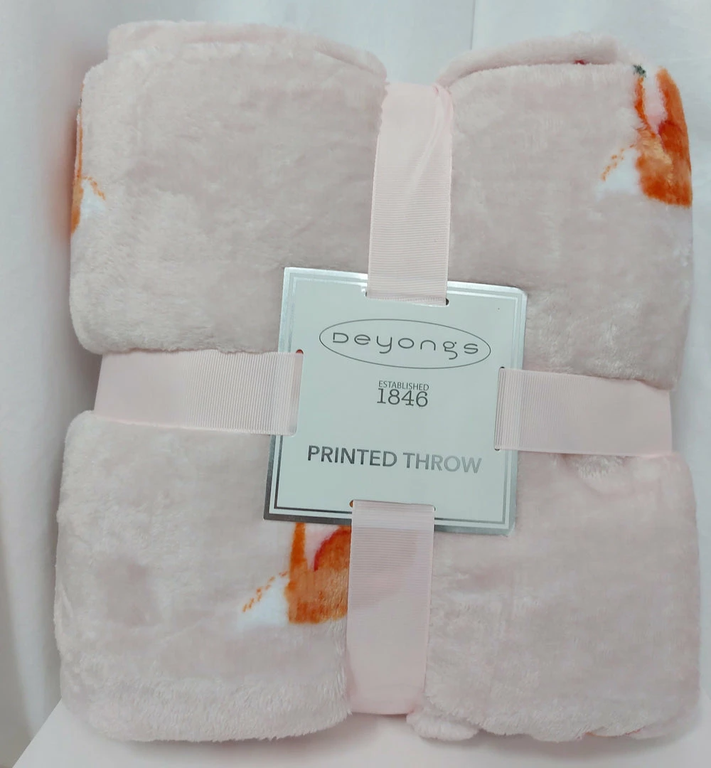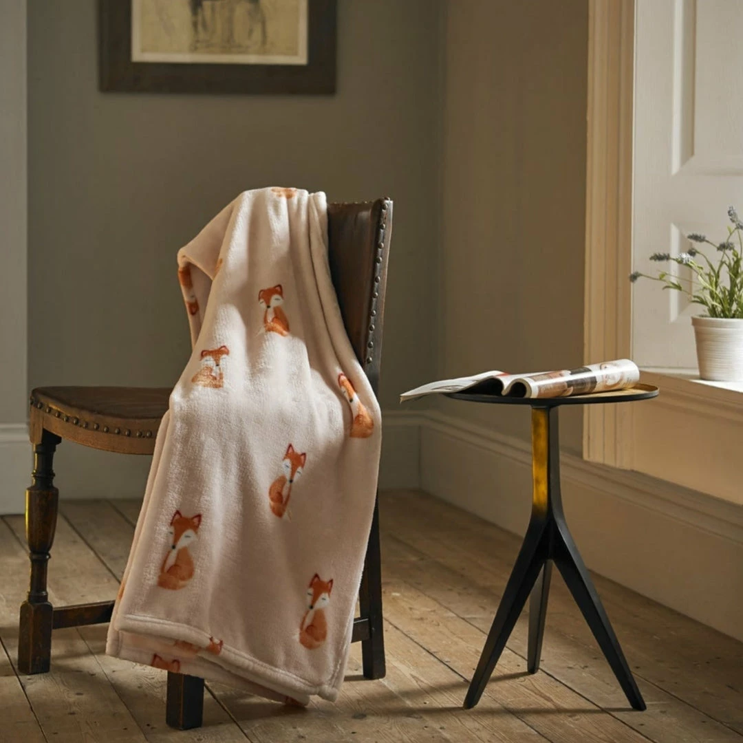 • An adorable fleece blanket featuring fun illustrations of shy foxes.