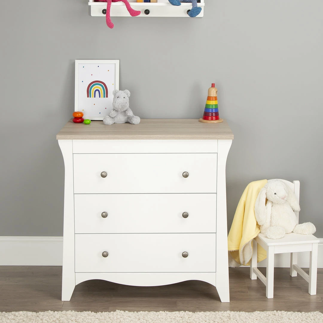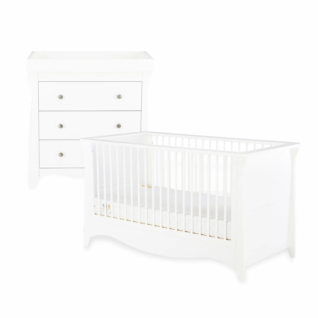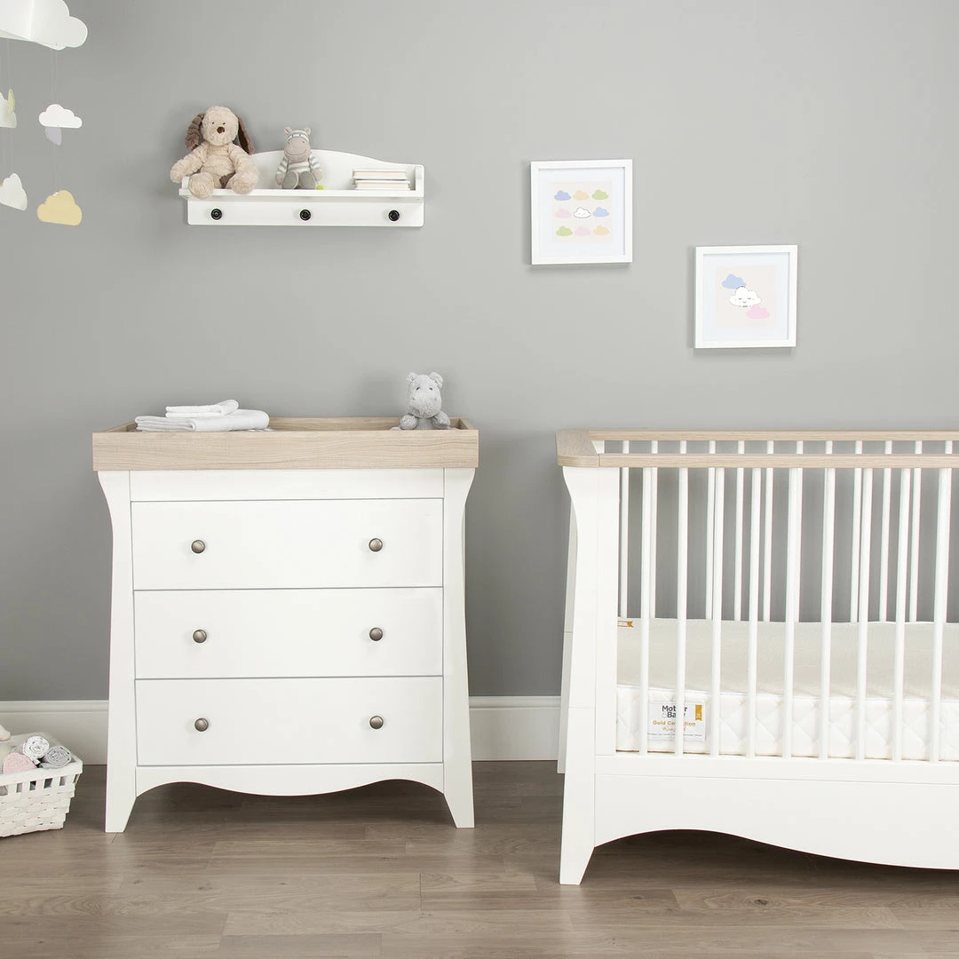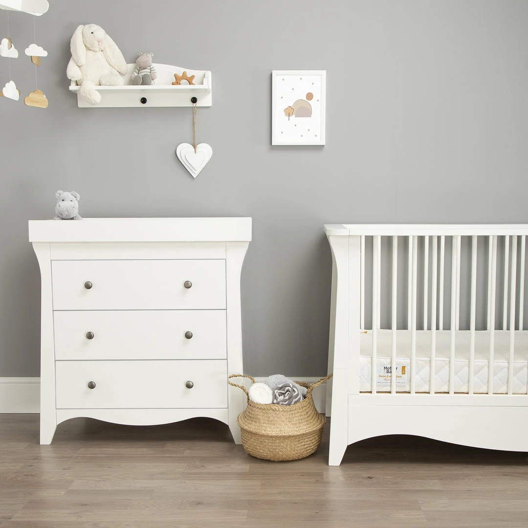 Complete your fairytale with the Cuddleco Clara 2-piece furniture set, including a cot bed, and 3 drawer dresser/ changer.