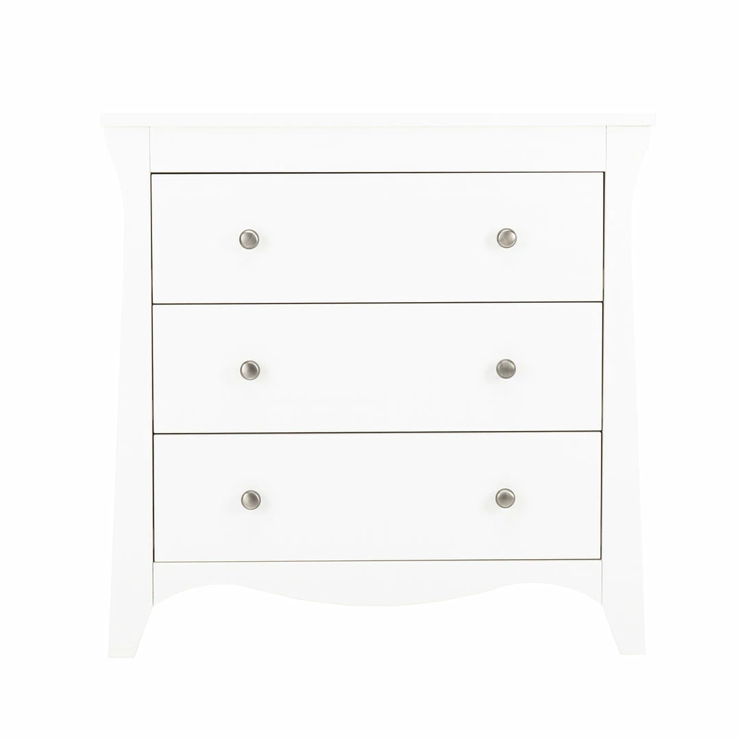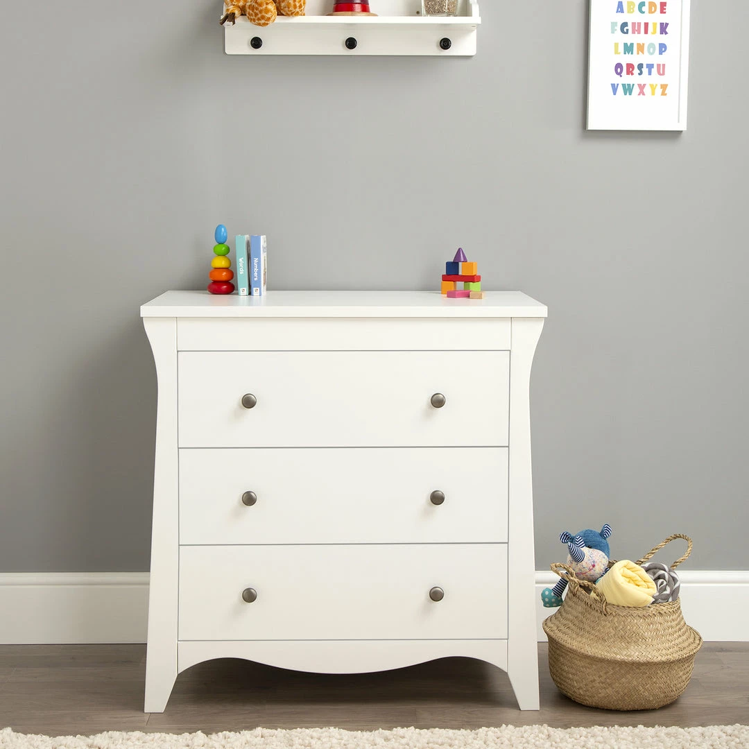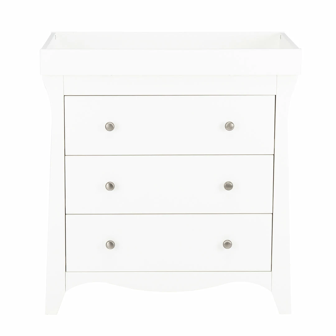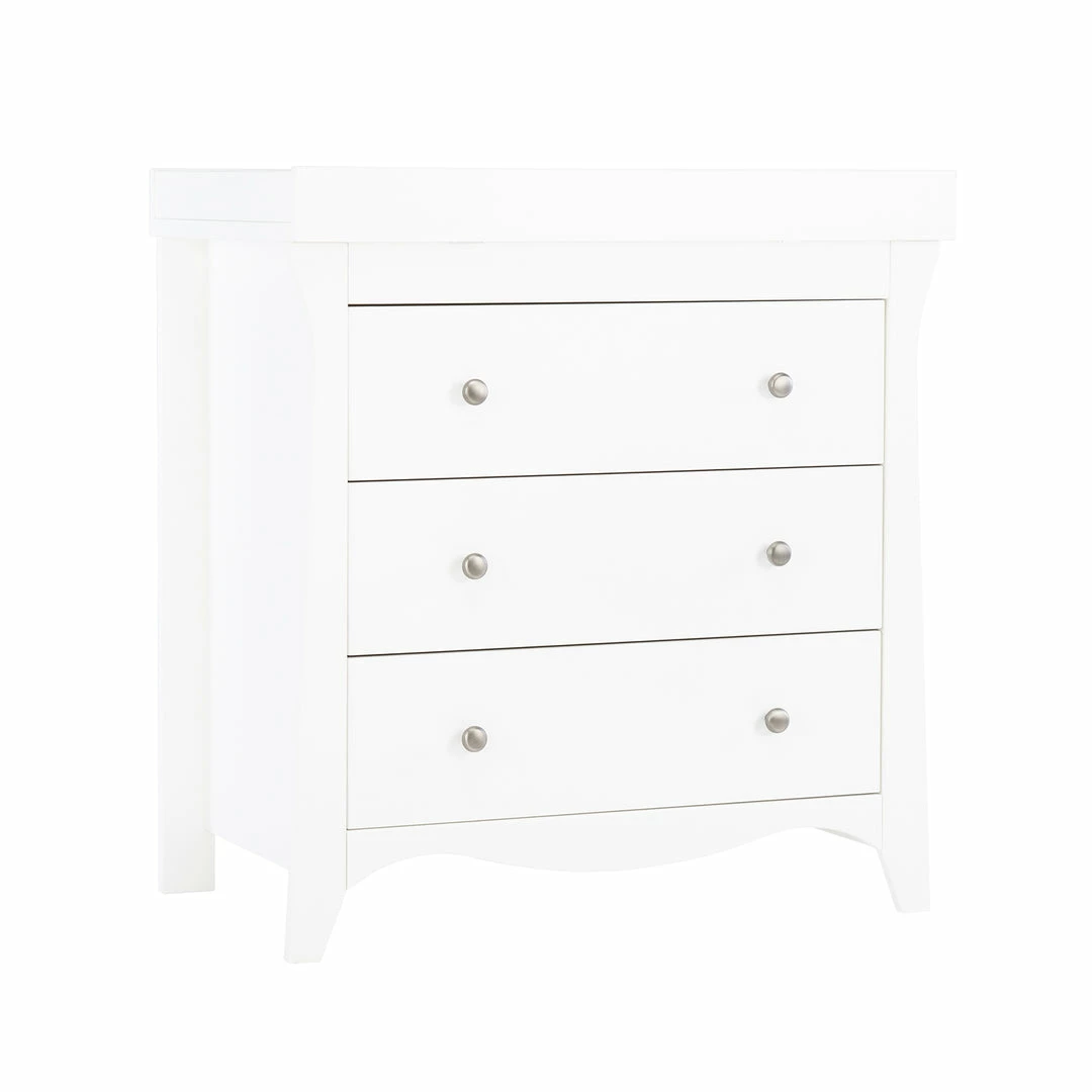 The Cuddleco Clara 3 drawer dresser is designed to offer you style, storage and function with three spacious drawers and a removable changing station.