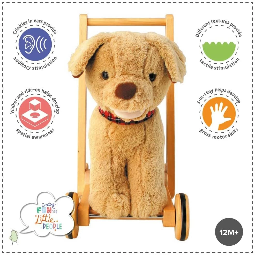 Supporting little ones as they take their first steps, Dexter Dog is raring to go! With his soft sandy furry coat and cute button nose, this super cute labrador is guaranteed to melt the hearts of little ones and become a loyal friend… Children will delight in taking Dexter for a walk, but there’s room on his back for added fun to hop on and enjoy the ride! Rubber tyres ensure against slipping on smooth floors.