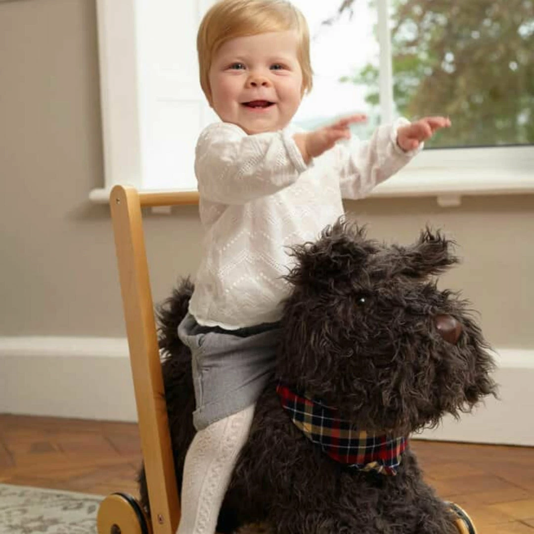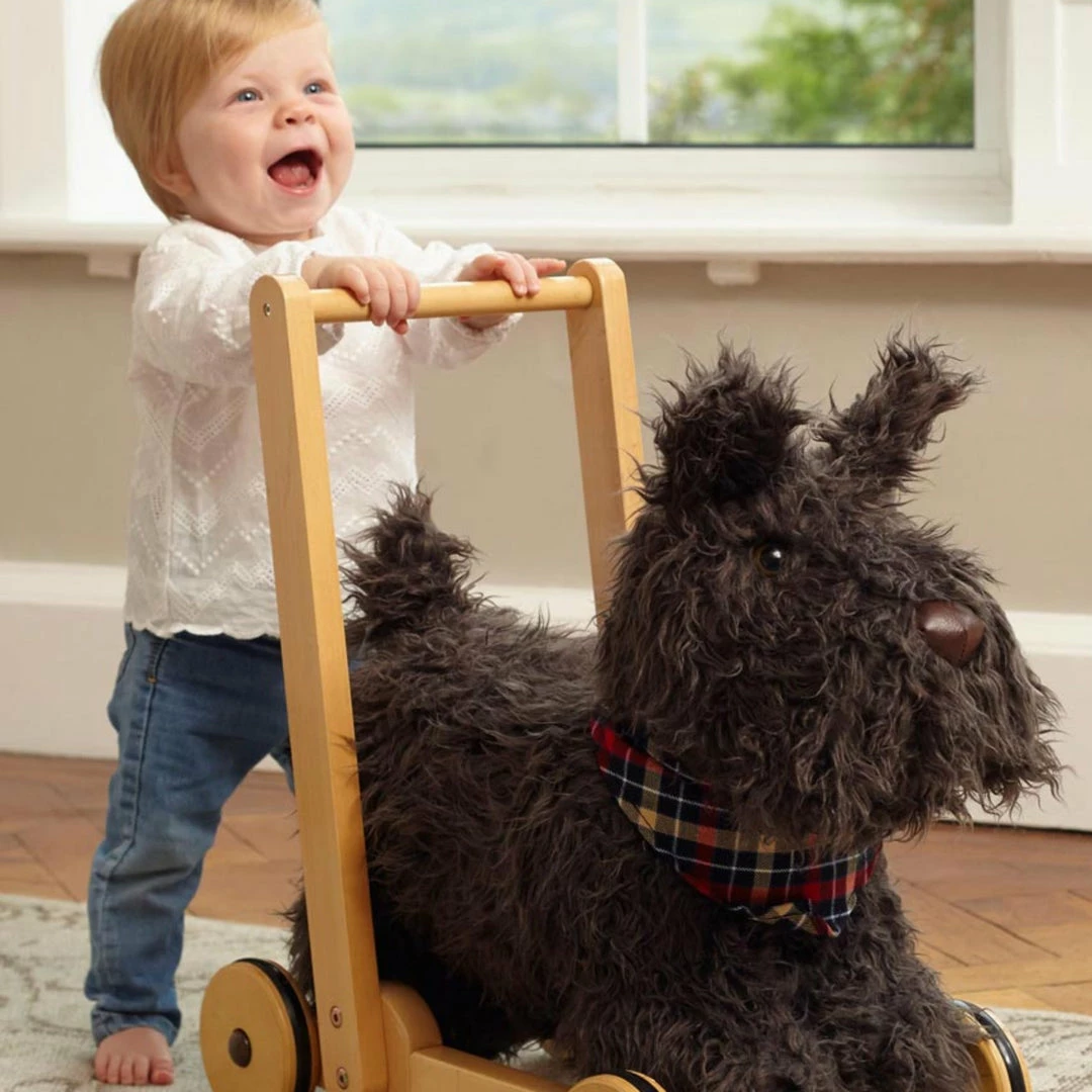 Supporting little ones as they take their first steps, Scottie Dog is raring to go! With his soft sandy furry coat and cute button nose, this super cute labrador is guaranteed to melt the hearts of little ones and become a loyal friend… Children will delight in taking Scottie for a walk, but there’s room on his back for added fun to hop on and enjoy the ride! Rubber tyres ensure against slipping on smooth floors.
