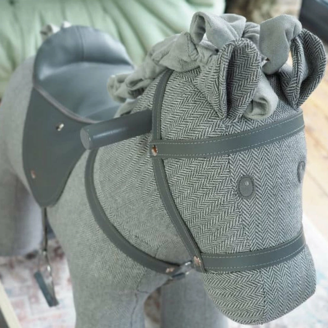 - Featuring a textured grey herringbone fabric, with a matching softly padded leatherette saddle and bridle.