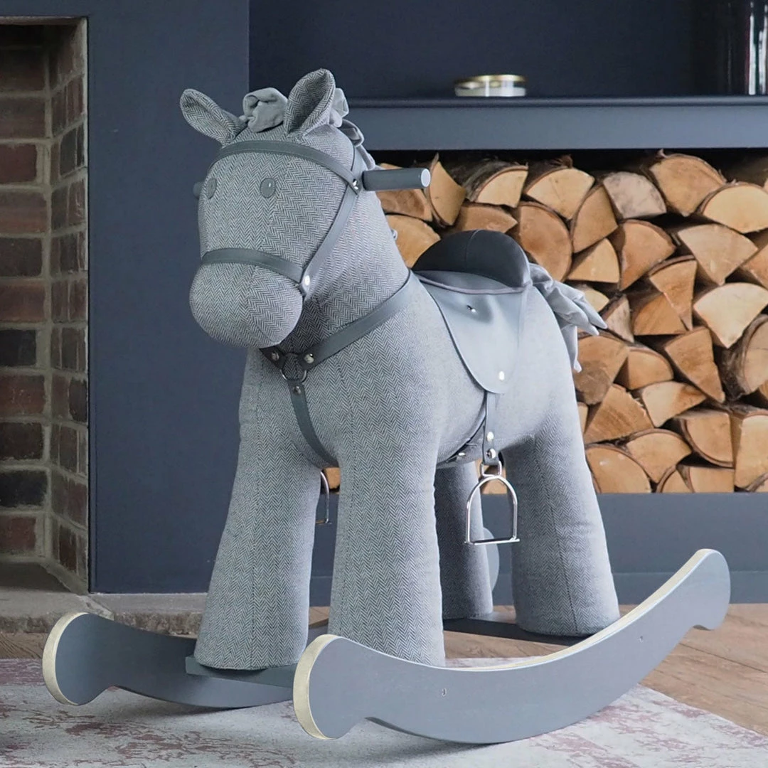 Irresistibly charming and offering the ultimate in rocking horse style, Stirling is a beautiful rocking horse, standing proudly on smart painted grey rocking rails with contrasting pale end grain. Dressed in an on-trend textured grey herringbone fabric, with a matching grey softly padded leatherette saddle and bridle, he suits both modern and traditional home interiors alike.