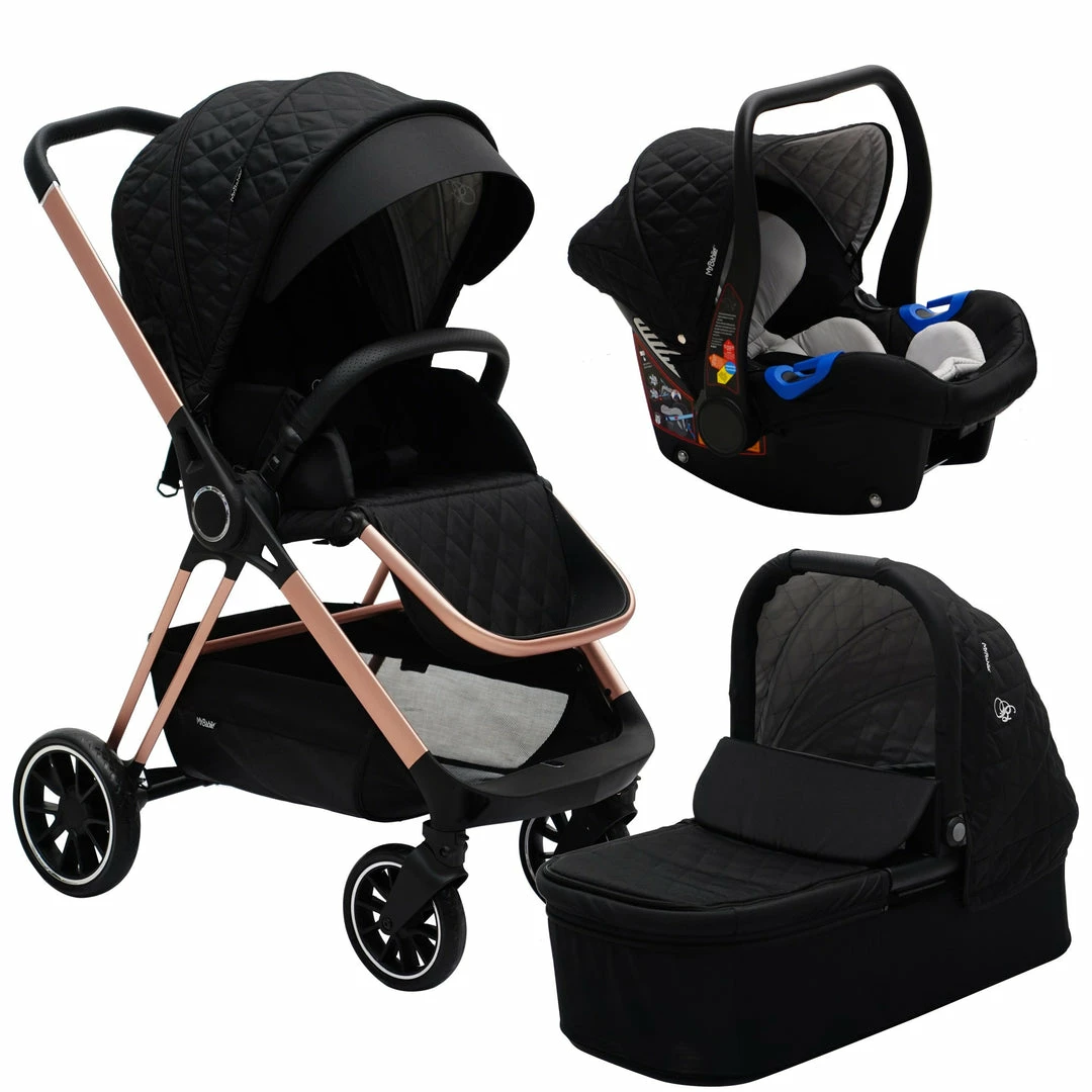 This stylish black quilted Travel System with a rose gold frame designed with Billie Faiers as part of her Signature Range is uniquely designed to adapt as your family grows.