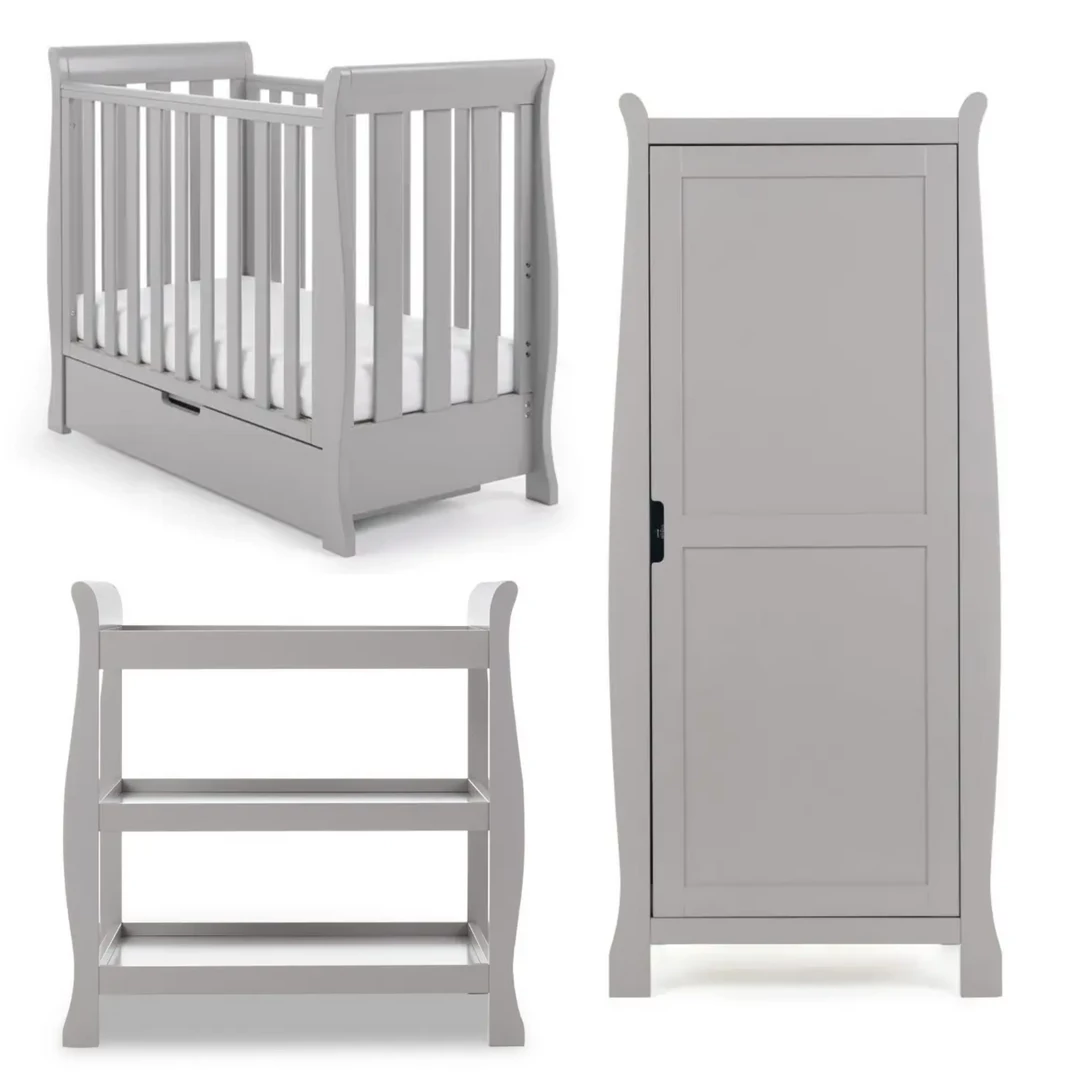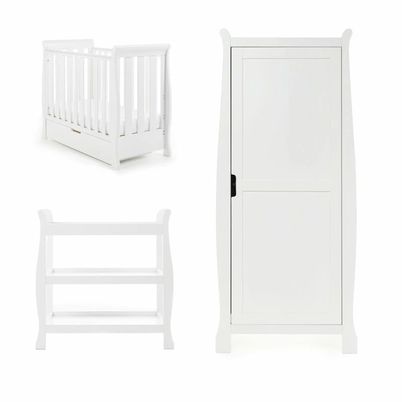 The Stamford Space Saver 3-piece room set consists of the beautiful and compact Stamford Space Saver cot with an under drawer, an open changing unit and a single wardrobe. All pieces feature the same elegant sleigh design that flows through the rest of the Stamford range.