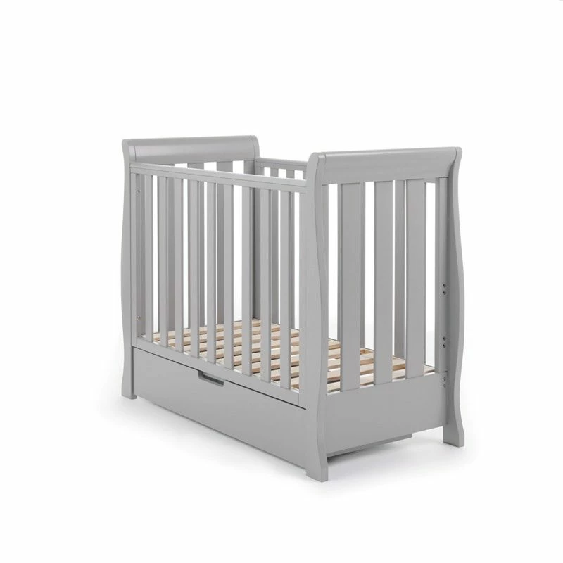 Needing less space than the Stamford Mini cot bed, the Space Saver cot features teething rails to protect your little ones’ delicate first teeth and a three-position adjustable mattress base. The top position allows your newborn to be put down and taken out of the cot easily without unnecessary bending, then as your child grows, learning to sit and stand, the base can be lowered by a further two positions providing extra security and reassurance all the way up to approximately 18 months old. Requires an Obaby 100 x 50 cm mattress.