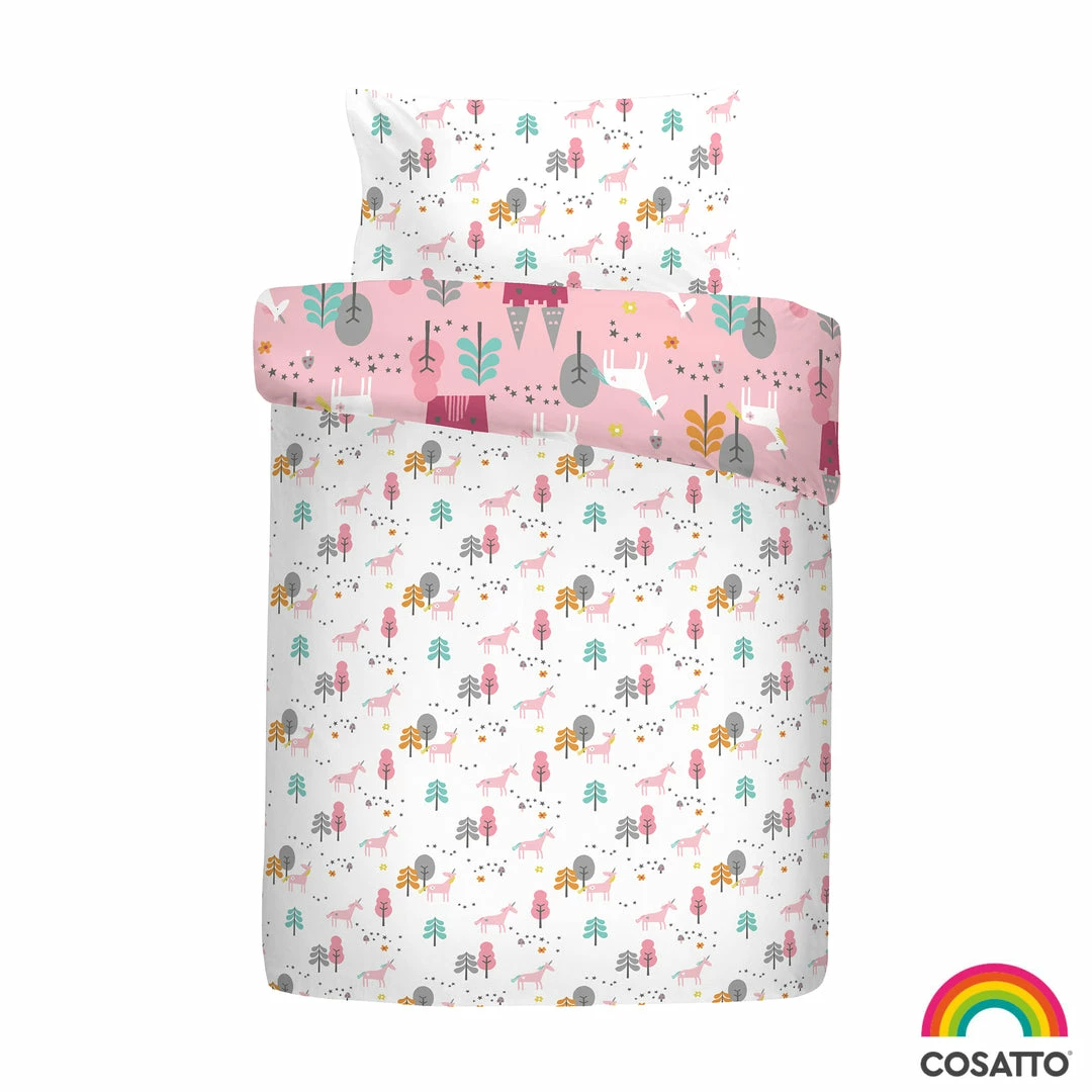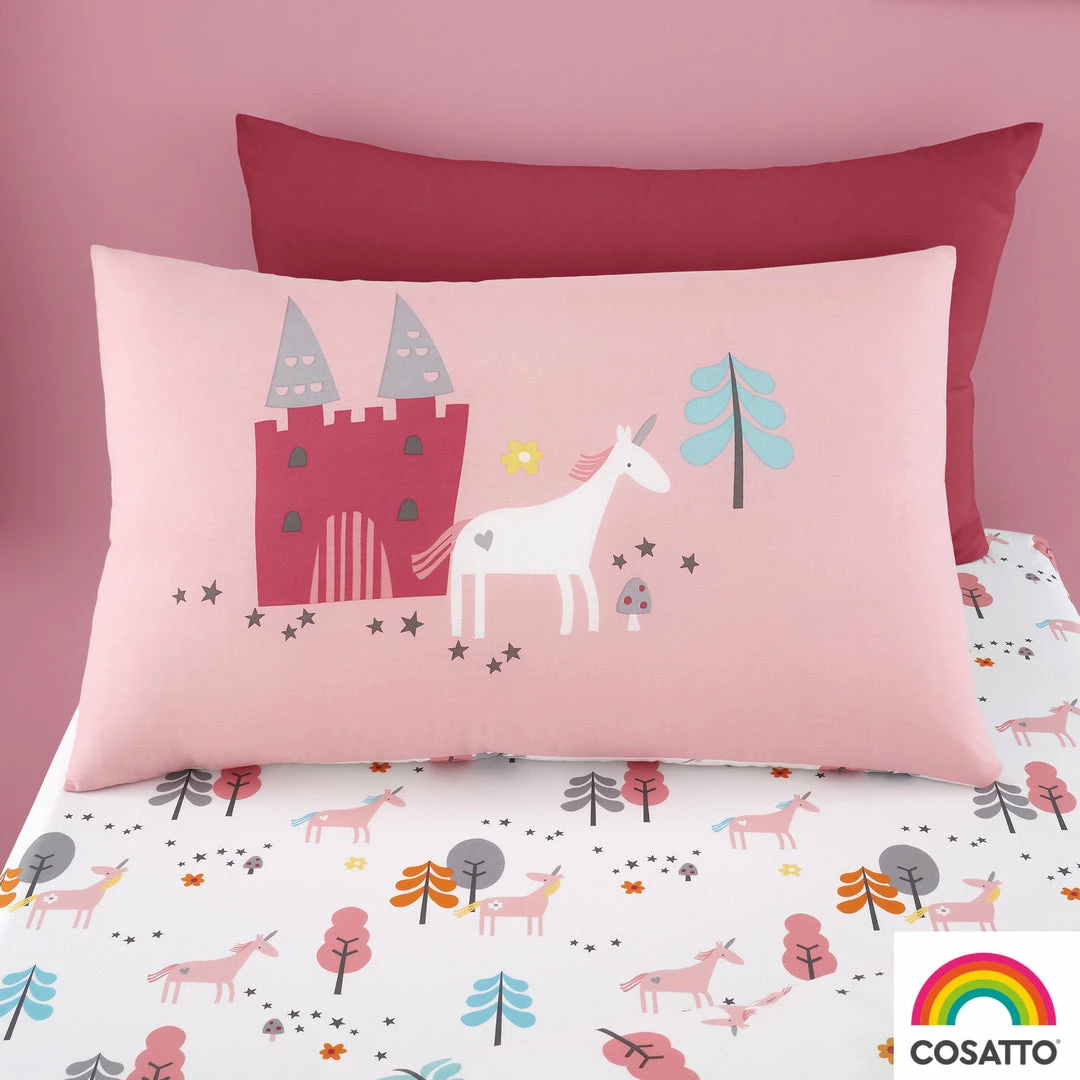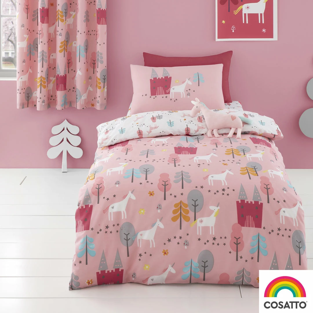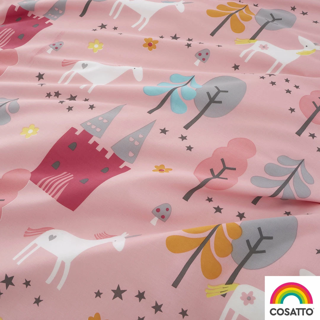 Every snoozer needs a unicorn, skipping in magic forests. Loving life. A sprinkling of stardust and youโre in Unicorn Land. Tiptoe beneath the moon with the noblest, sweetest unicorns ever. Their mission, to party with you in a dream castle, eating unicorn toast. Fly with dream unicorns to far-flung castles and be home by daybreak. This fun duvet cover set comes with a matching pillowcase and is reversible with pink or white for 2 different looks.