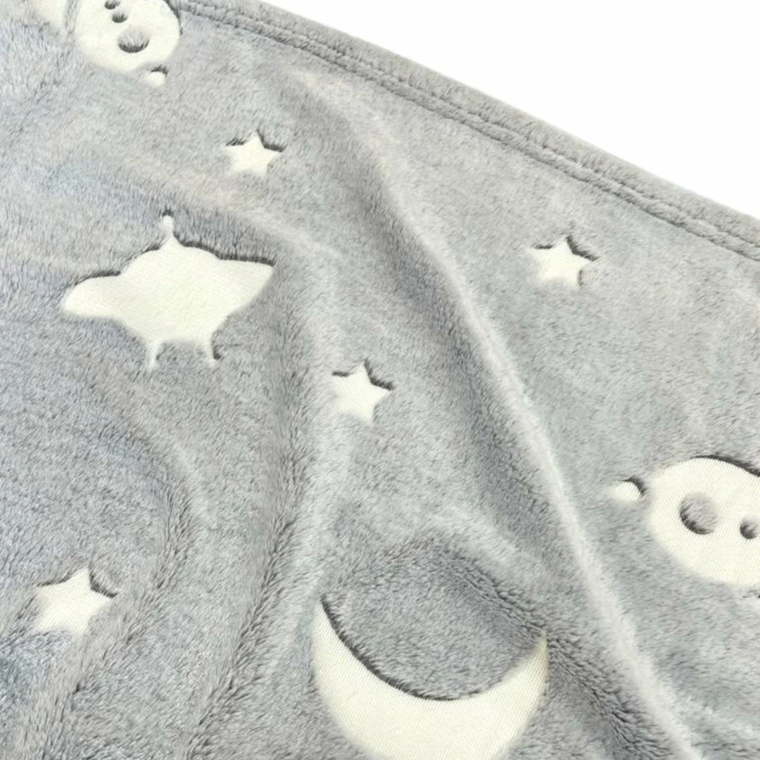 โข A stylish fleece blanket featuring glow in the dark space shapes!